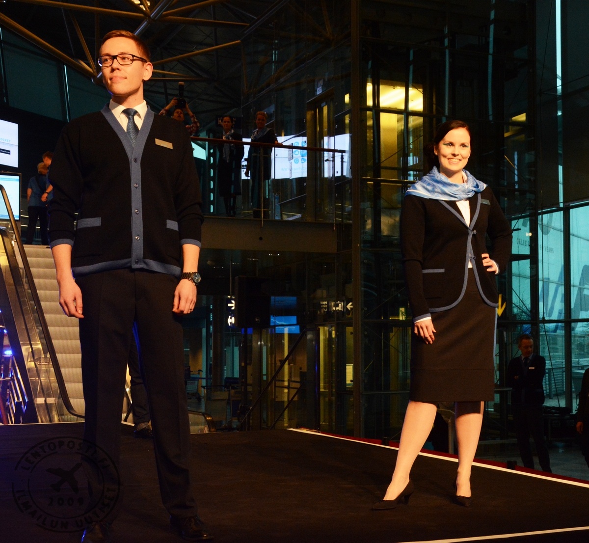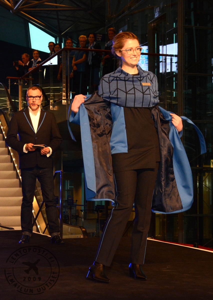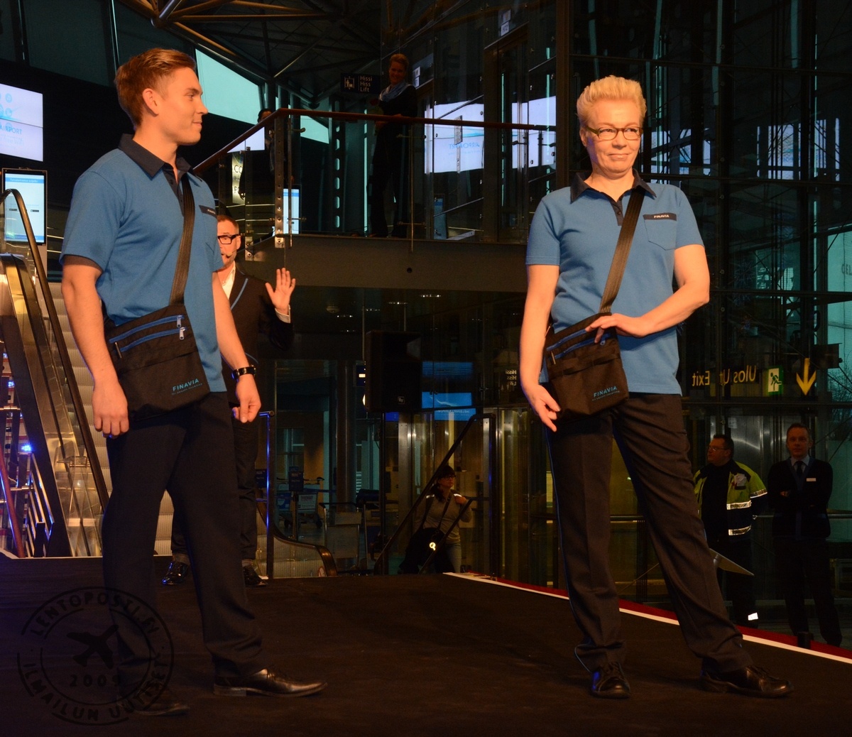 Asut suunnitelleen Touchpointin mukaan nyt esitellyissä vaatteissa uutta on koko mallisto, vanhaa ylijäämäkankaan hyödyntäminen, sinistä värimaailma ja lainattua kiitotiekuosi. Tämän hääkuvioista tutun yhdistelmän innoittamana uusien asujen muotinäytöksen päätti portaita alas lähtöaulaan askeltanut morsiuspukua kantava malli. Hänenkin asunsa oli kierrätysmateriaaleista koottu, mutta se ei sentään kuulu Finavian uuteen puvustoon. Lopuksi häätyyliin heitetyn kukkakimpun nappasi näytöstä katsomaan pysähtynyt matkustaja.