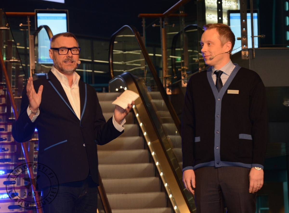 Finavia oli 10. joulukuuta rakennuttanut komean Catwalkin eli muotinäytöksen esiintymislavan miltei pääoven eteen. Näytöskatsojista huolimatta myös matkustajat pystyivät hakeutumaan lähtöselvitykseen, sillä menossa oli aseman päivärytmissä hiljaisin hetki. Tapahtuman juonsi Jaakko Selin (alla, klikkaa kuvat suuremmaksi).