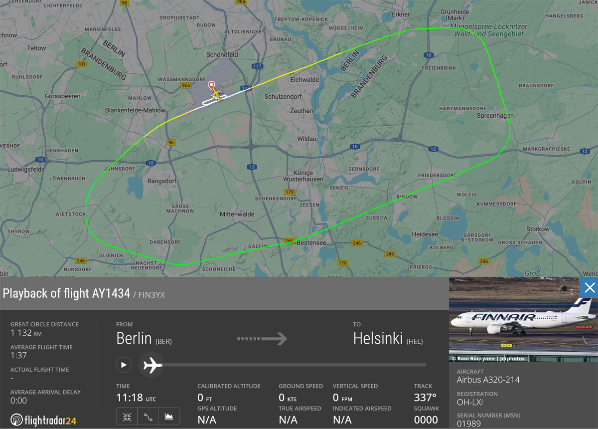 Finnairin Airbus A320 nousi maanantaina 31. maaliskuuta 2025 ilmaan Berliinin Brandenburgin lentokentän kiitotieltä 25L. Alkunousu jatkui noin 4000 jalan korkeuteen, jonka jälkeen kone jäi vaakalentoon. Lentäjät laskeutuivat takaisin Brandenburgiin kiitotielle 25L noin 14 minuutin lennon jälkeen. Koneessa oli Aviation Heraldin mukaan 160 henkilöä.