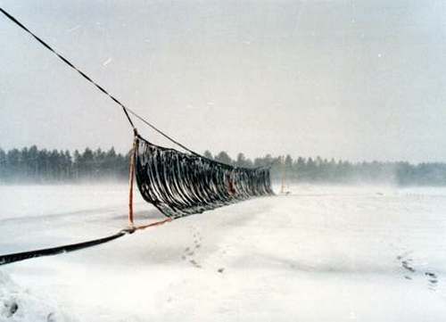 Ilmavoimat on käyttänyt kotimaisen A-Laskuvarjon pysäytysverkkoja vuodesta 1984. Valmistajan kuvassa UOTILA 24 -verkko nostettuna Jämsän Hallin kentällä. Verkon toiminta perustuu siihen, että koneen runko sujahtaa pystysuorien rakenteiden välistä. Jarruttava voima kohdistuu koneen siipiin, jotka ovat sen vahvimmat osat.