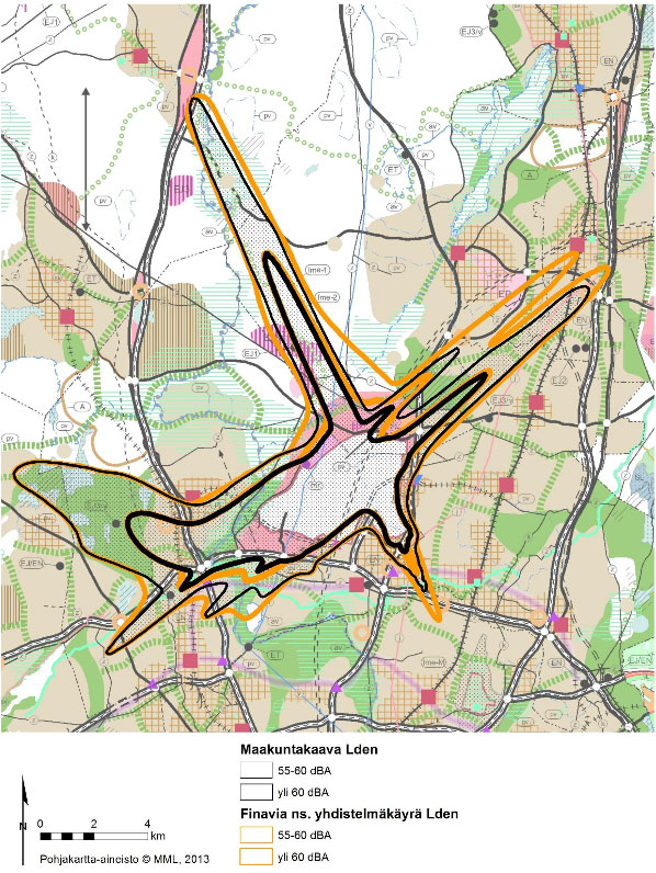 Tarkastelualueena on meluvaikutusten osalta Lden 55-60 dBA ja Lden yli 60 dBA alueet sekä Finavian kehitysennusteen (v. 2007) että lainvoimaisen maakuntakaavan mukaisina. Lisäksi tarkastellaan +0.5 tai +1.0 dB puskurivyöhykettä Lden 55-60 dBA (Finavian v. 2007 mukainen kehitysennuste) alueen ympärillä.