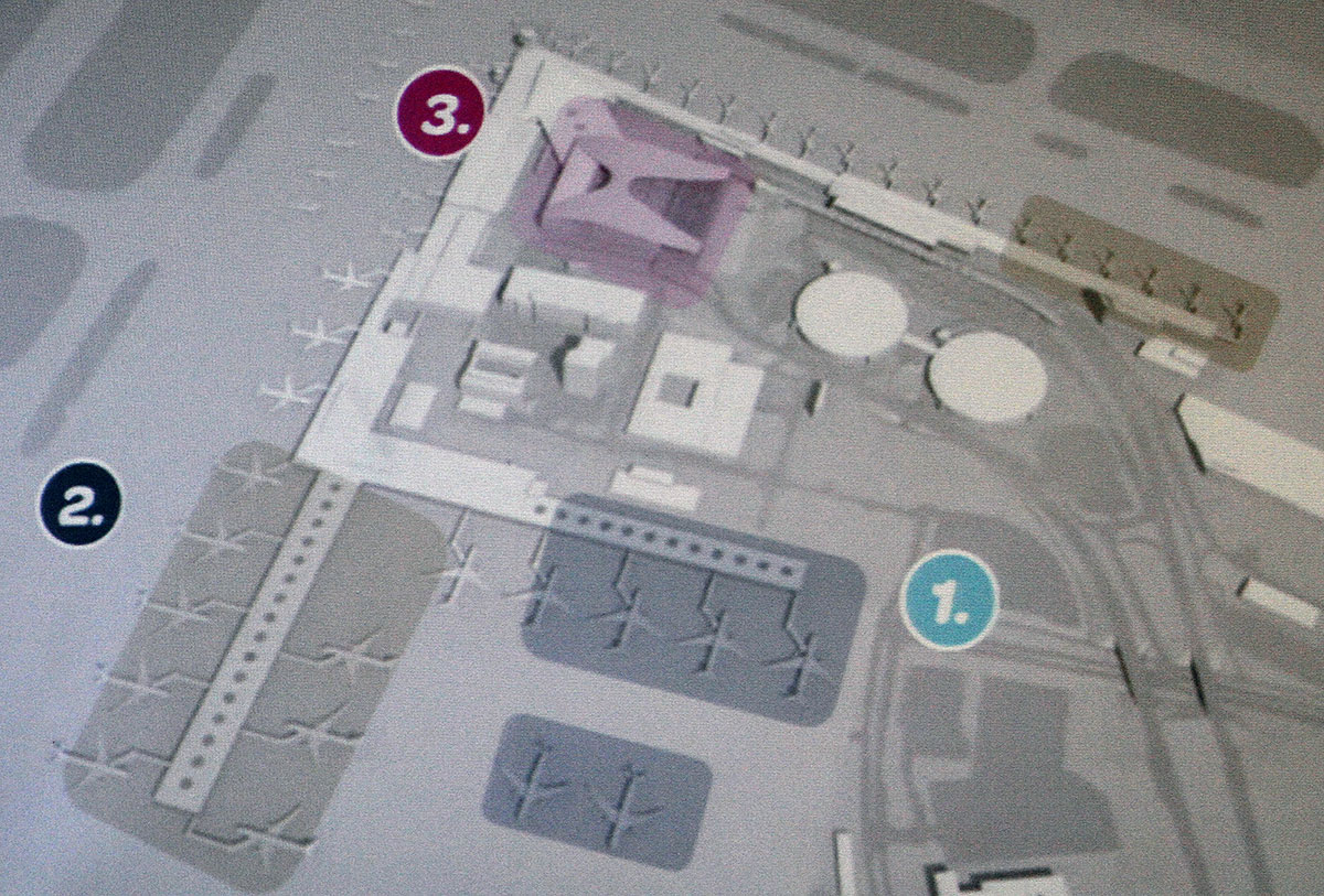 Odotustilat sijaitsevat 2. kerroksessa terminaalitasolla. Lähtöportilla on tilaa noin 145 neliömetriä per portti. Tarvittaessa lisätilaa saadaan käytäväalueelta. Koneeseen siirtymine ntapahtuu 2. kerroksessa odotustilan päädyssä. Matkustajajat laskeutuvat alas asematasolle porras- ja hissiyhteydellä. Alkuperäinen suunnitelma sisältää vain tarpeelliset matkustajatilat. Liike- tai palvelutiloja uuteen osaan ei tule. Laajennus sijoittuu jatkoksi nykyiselle T1-terminaalille, ja se suuntautuu kohti Airside Centerinä tunnettua toimistorakennusta. Uusi laajennus tulee lähes kiinni toimistorakennukseen sen kiitotien 15-33 -puoleiselle sivulle.