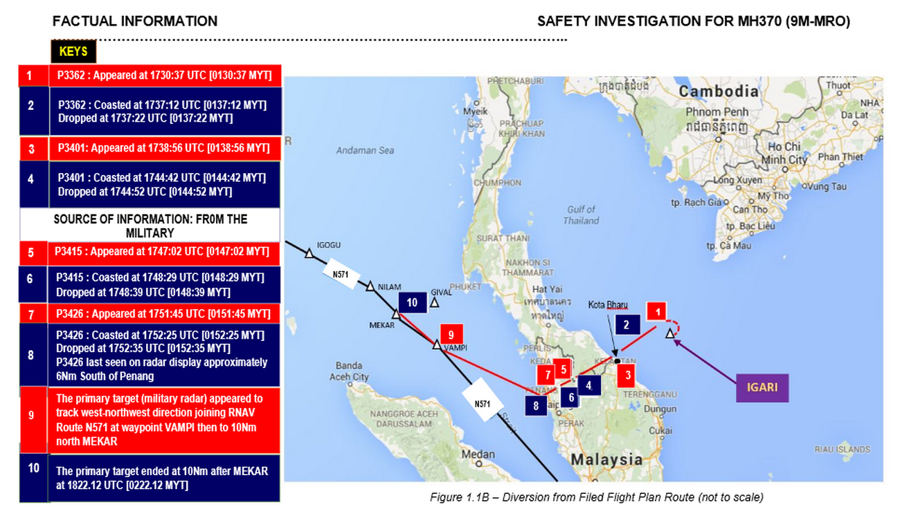 Meren ylle tultuaan 9M-MRO kääntyi luoteeseen kohti lentoväylää N571. Kohde katosi lopullisesti tutkasta reittipisteen MEKAR jälkeen (kartta). On esitetty epäilyksiä, että tutkavastaaja olisi tahallisesti sammutettu. Tutkijat ovatkin laajasti selvittäneet mm. koneen miehistön taustoja, Ohjaajien taloudellisista kytköksistä ei löytynyt mitään epätavallista. Myöskään viime aikaisia muutoksia käyttäytymisessä ei havaittu. Ohjaamomiehistön toimintaa lentoasemalla ennen koneeseen nousemista selvitettiin valvontakameroiden tallenteista. Niitä verrattiin aiemmin nauhoitettuihin. Mitään normaalista poikkeavaa ei niissäkään havaittu. Myöskään lentäjien terveystiedoista ei löytynyt myöskään mitään poikkeavaa esimerkiksi masennukseen viittaavaa.