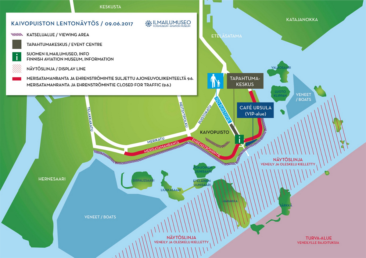 Turva-alueella ankkurointi, pysähtyminen ja alusten kokoontuminen on kuitenkin kielletty ilman lentonäytöksen järjestäjän lupaa. Lentonäytöksen merialueen valvonnan ja pelastusvalmiuden tehtävissä on mukana sekä Suomen meripelastusseuran jäsenyhdistysten että Turvallisesti vesillä ry:n aluskalustoa. Nämä lentonäytöksen kielto- ja turva-alueet ovat voimassa torstaina 8.6. kello 17.00 - 20.00 sekä perjantaina 9.6. kello 16.00 - 21.00. Lentonäytöstä veneellä seuraamaan saapuville on osoitettu kaksi katselualuetta, joihin järjestäjä pyytää katsojien saapuvan perjantaina 9.6. vasta kello 15.00 jälkeen.
