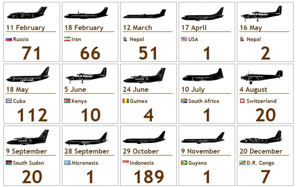 Samainen syy on mahdollisesti taustalla vuoden ensimmäisessä eli Saratov Airlinesin Antonov An148 -koneen turmassa. Vanhin lentoturmaan joutunut koneyksilö oli vuonna 1939 valmistunut Junkers Ju 52 -kone. Se tuhoutui Sveitsissä kyydissään 20 ihmistä, kun koneen hallinta menetettiin.