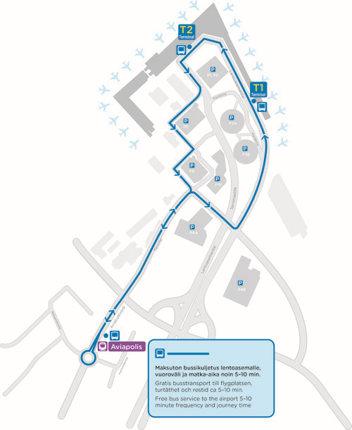 Lentoaseman juna-aseman käyttöönottoon asti Aviapoliksen juna-aseman ja lentokentän terminaalien välille järjestetään maksuton bussikuljetus. Bussien matka-aika lentoasemalle on noin viisi minuuttia, ja ne kulkevat noin viiden minuutin välein junien liikennöintiaikana.