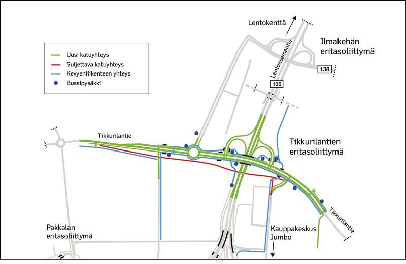 "Eritasoliittymä sekä Tikkurilantien ja Lentoasemantien risteysalueen uudet järjestelyt saadaan liikenteen käyttöön maanantaina 29.9. päivällä, jolloin liikennevalot Lentoasemantiellä poistetaan käytöstä. Liikenteen katkotonta kulkua helpottavat valojen poistamisen lisäksi luonnollisesti uudet rampit, jotka tekevät Tikkurilantieltä Lentoasemantielle liittymisestä sujuvampaa", projektipäällikkö Antti Koski Liikennevirastosta kertoo. Lentoasemantien ja Tikkurilantien risteysalueen valmistuessa liikenne Vanhalla Tikkurilantiellä välillä Perintötie–Pakkalantie siirtyy kokonaisuudessaan uudelle tielinjaukselle. Samaan aikaan otetaan käyttöön uuden linjauksen varteen rakennetut, katoksin varustetut bussipysäkit. Alueella avataan myös uusia kevyen liikenteen yhteyksiä, jotka kulkevat Tikkurilantien suunnassa Työt Lentoasemantien ja Kehä III:n risteyksessä jatkuvat Lentoasemantien alueen urakassa rakennetaan toinen uusi eritasoliittymä hieman etelämmäksi, Kehä III:n ja Lentoasemantien risteykseen. "Kehä III:lle tulevan eritasoliittymän rakennustyöt jatkuvat sillan valutöillä. Alueen tieverkkoa kehitetään laajemminkin, esimerkiksi rakentamalla uusi kiertoliittymä Lentoasemantien eteläosaan Virkatien ja Äyrikujan välille", Koski kuvaa. Liikenteen ruuhkakohtia Lentoasemantien seudulla poistavat myös Pakkalan eritasoliittymässä tehtävät ramppijärjestelyt sekä Kehä III:lle rakennettava lisäkaista Tuusulanväylän ja Lentoasemantien välille. Kokonaisuudessaan työt alueella valmistuvat vuoden 2016 loppuun mennessä. Lue myös aiempia uutisiamme Helsinki-Vantaan lentoaseman liikennehankkeista: