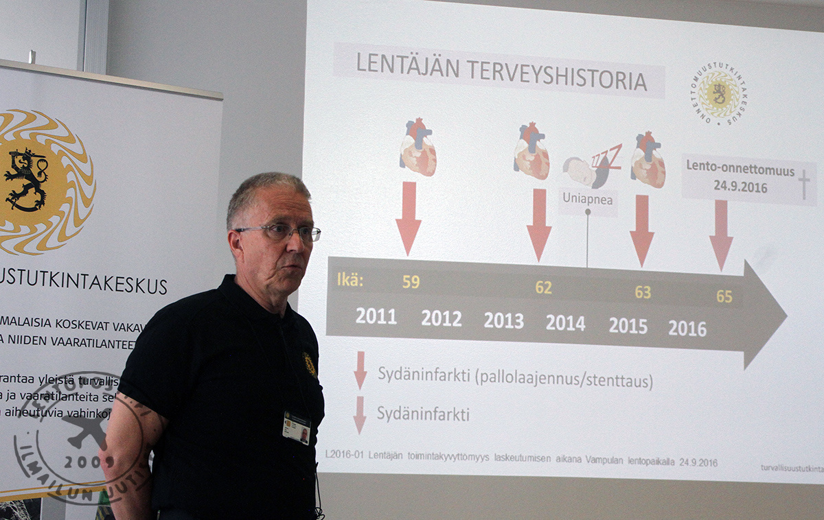 Löydökset tehtiin turvallisuustutkinnassa Vampulan lentopaikalla 24. syyskuuta 2016 tapahtuneesta pienlentokone-onnettomuudesta. Cessna 172N -koneen ohjaaja sai sydänkohtauksen lennon aikana. Lentäjä oli päättänyt palata paikallislennolta laskuun huonovointisuuden seurauksena. Lasku päätyi kiitotien sivuun ja lopulta ojaan. Ohjaaja ja matkustaja poistuivat koneesta mutta pian tämän jälkeen ohjaaja menehtyi. "Tutkinta on sisällöltään varsin poikkeuksellinen", kertoo ilmailuonnettomuuksien johtava tutkija Ismo Aaltonen. Turvallisuustutkintaan ja -löydöksiin perustuvat turvallisuussuositukset käsittelevät ilmailulääketiedettä. Lentäjän terveys oli keskeisessä roolissa tapahtuneessa lentoturmassa. OTKESin mukaan lentäjän terveydentilan kokonaisriskiarvio ja terveyden hoito olivat puutteellisia. Lentäjää hoitaneilla terveydenhuollon ammattilaisilla ja valvovalla viranomaisella ei ollut yhteistä kokonaistilannekuvaa lentäjän terveydestä. Lentäjällä oli toistuvuutta vakavissa sairauksissa ja hänelle oli tapahtunut useita sydäninfarkteja. Erilaisten hoitotoimenpiteiden jälkeen ohjaaja sai luvan lentää ja vain kymmenen päivää tämän jälkeen hän sai kolmannen sydäninfarktin. Siitä ei enää tullut raporttia ilmailuviranomaiselle.