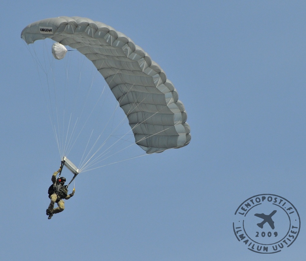Navigatorin 240 sqft -versiota käytetään kun taistelijan varustus on kevyt. Jos myös reppu on mukana, suurempi 280 neliöjalan varjo otetaan käyttöön. Samaa nollakankaista kuputyyppiä käytetään myös siviililaskuvarjohyppääjien koulutuksessa. Kohdealueen tiedustelun jälkeen paikalle lensi kaksi NH90-kopteria, joista toisesta varsinainen iskuryhmä teki Fast Rope -köysilaskeumisen kohteeseen. Ensimmäisen laskeutujan mukana oli myös sotilaskoira kantolaitteessa (yllä, klikkaa kuvat suuremmaksi)