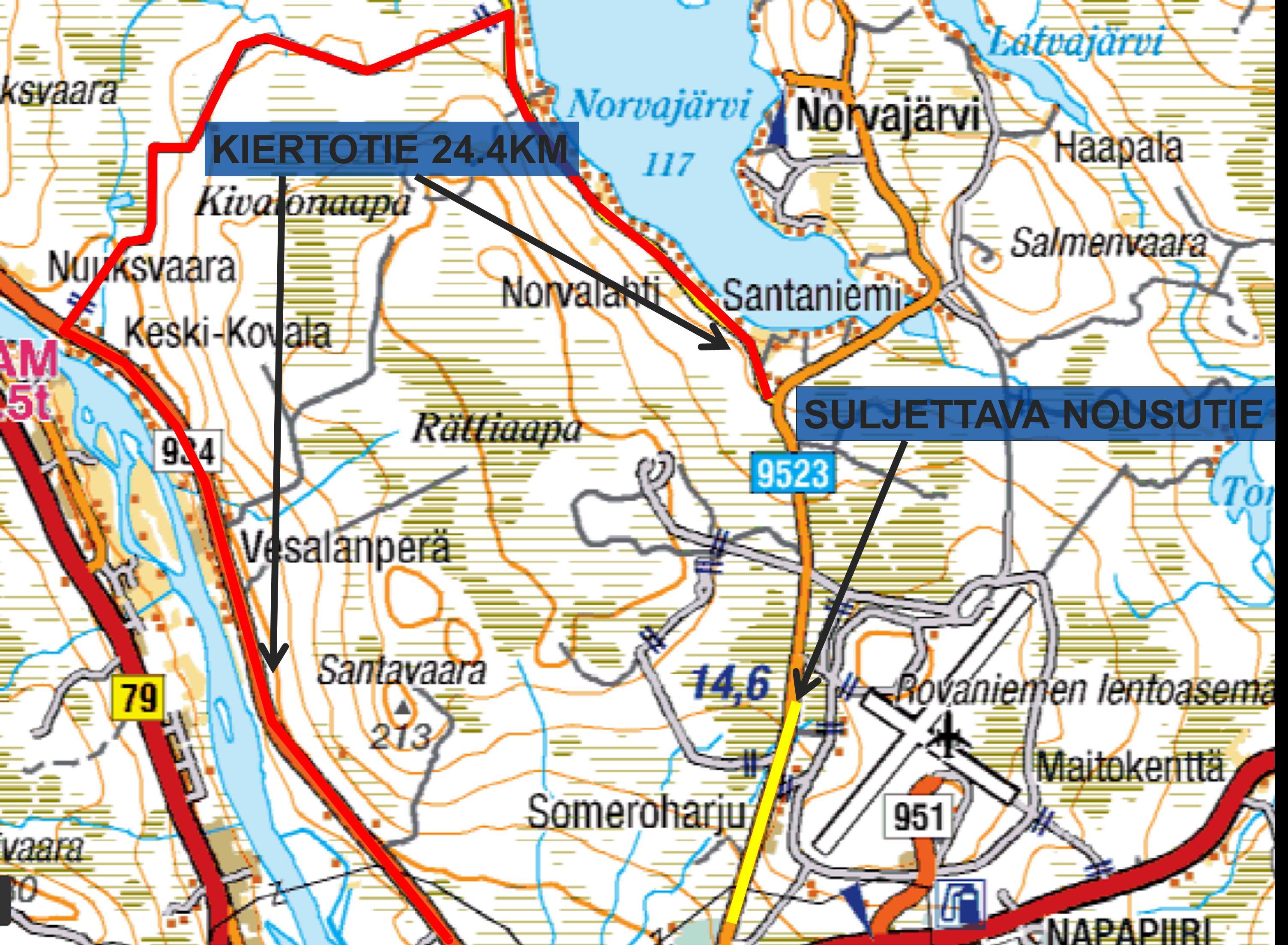 Ensisijaisen kiertotien reitti kulkee Norvatien (814) risteyksestä Norvan länsitietä pohjoiseen, josta Hanhiselän yksityistietä Nivankylään Ounasjoen itäpuolentielle, 1118 kohdalle. Ilmavoimien mukaan Hanhiselän yksityistie on kapea ja siinä on vähän kohtaamispaikkoja. Kulku järjestetään etuajoneuvolla saattamalla noin 30 minuutin välein vuoroin kummastakin suunnasta.