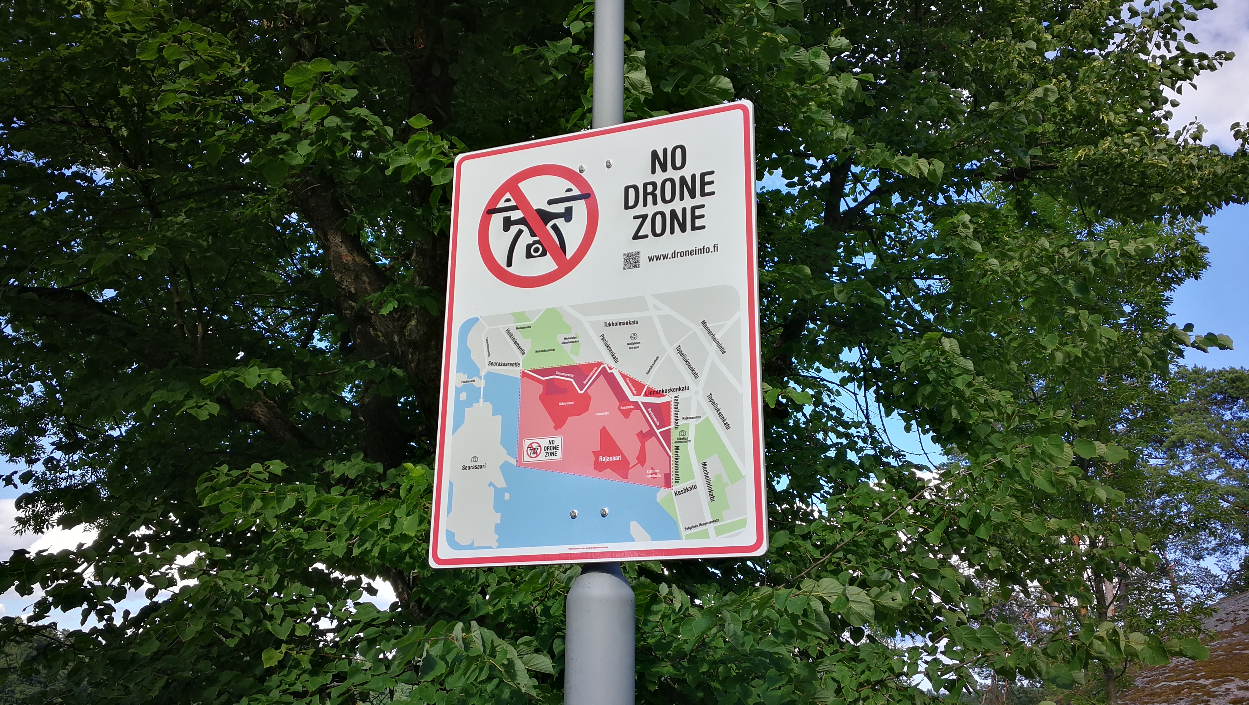 Poliisihallituksen, Helsingin poliisin ja Helsingin kaupungin yhteishankkeena Meilahden (EFP35), Munkkiniemen (EFP40) ja Kruununhaan (EFP50) kieltoalueiden olemassaolosta kertovia No Drone Zone -kylttejä.