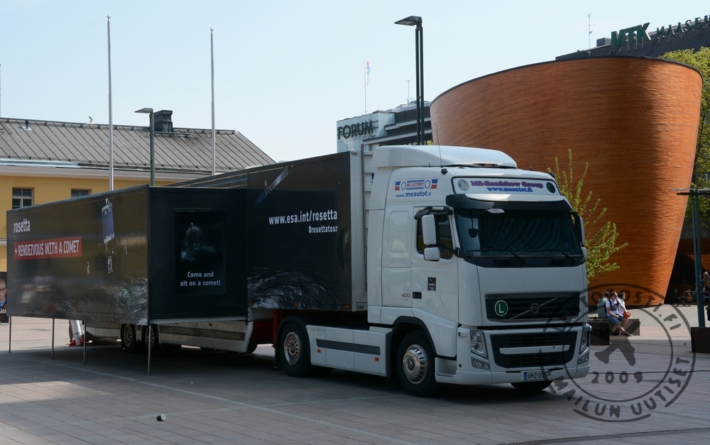 Vierailijat pääsevät halutessaan istumaan komeetan pintaa mallintavalla alustalla (kuva vasemmalla). Samaten pääsee näkemään, kuinka ytimen materiaalia kokkaillaan varsin tavallisista ainesosista. Komeetat koostuvat vedestä, hiekasta, hiilestä, hiilidioksidijäästä ja pienistä määristä orgaanista materiaalia (rekassa sitä simuloitiin Tabascolla), alkoholia ja ammoniakkia. Rekassa kokataan näistä aineksista mustaa höyryävän kylmää loskaa, jollaisesta komeettojenkin arvioidaan rakentuvan (otsikkokuvassa). Rekka on Helsingissä Narinkkatorilla vielä tiistaina 20. toukokuuta. Maanantaina rekassa vieraili myös ESA:n Mark McCoughrean, tiedeohjelman ylin tiedotusvastaava ja Rosetta-lennon johtava tutkija. Rosetta on ESA:n kunnianhimoisin hankke. Sen tarkoituksena on paitsi laskeutua ensimmäisen kerran pyrstötähden pinnalle, niin myös lentää sen mukana lähelle aurinkoa. Silloin voidaan seurata miten komeetat muuttuvat kuolleista likaisista lumipalloista kaasua syökseviksi pyrstötähdiksi.