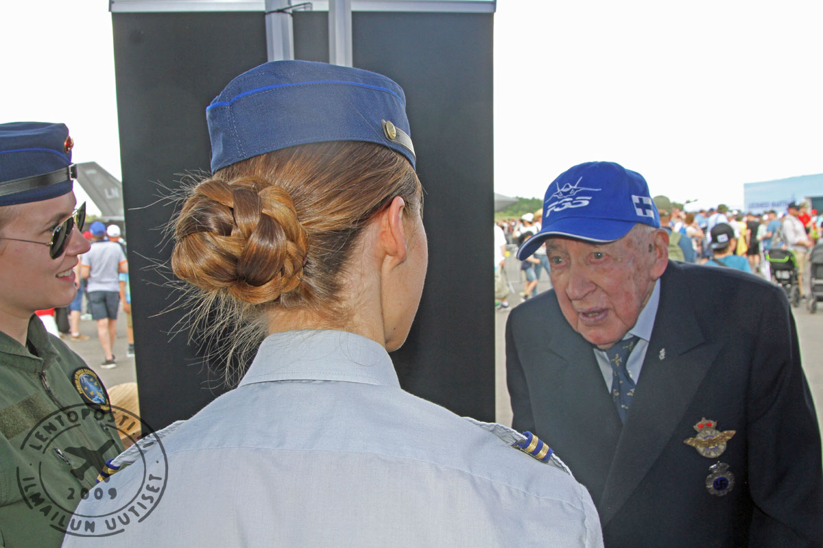 Kaikkiaan 21473 lentotuntia Ilmavoimissa, Finnairissa ja muuallakin ilmaillut liikenne-, tiedustelu- ja hävittäjälentäjä, sotaveteraani ja pilvenveikko sekä kokenut kouluttaja ja tarkastuslentäjä Mauri Maunula vieraili Turun lentonäytöksessä 17. kesäkuuta 2023.
