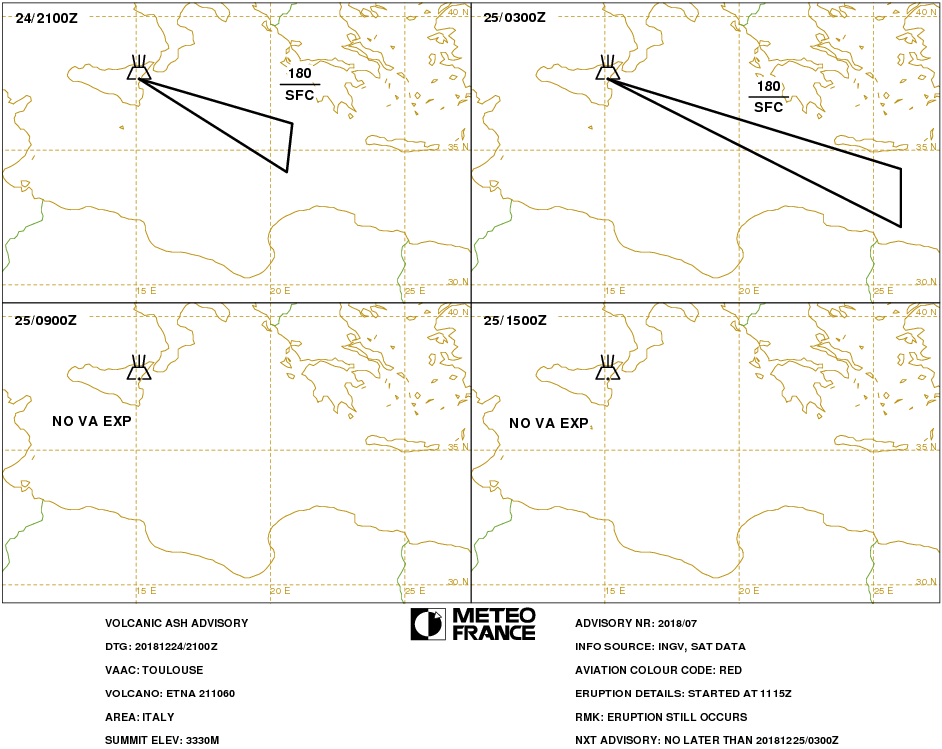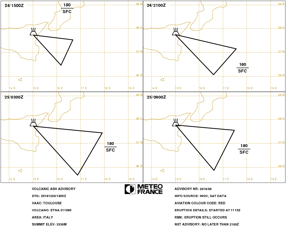 Toulousen VAAC:n (Volcanic Ash Advisory Center) julkistama ASHTAM-tuhkatiedote kertoo pilven olevan Etnan kaakkoispuolella ja nousseen lentopinnalle 180 eli noin 5,5 kilometrin korkeuteen.