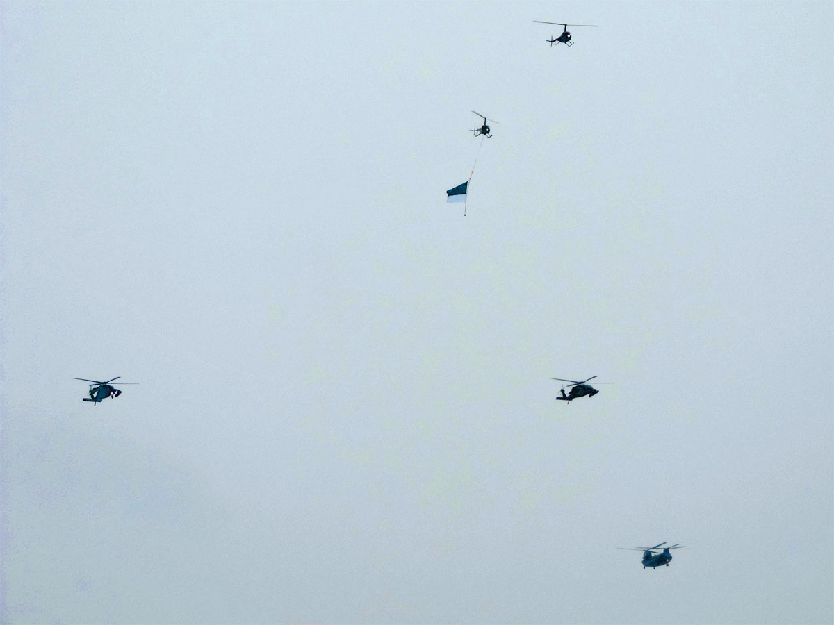 Juhlaparaatin ylilentoon odotettiin nousevan Ämarin lentotukikohdasta muodostelma jossa oli määrä lentää Viron R44, Ison-Britannian Chinook ja Yhdysvaltain Black Hawk -helikopterit. Kiinteäsiipisen kaluston osalta paraatiin odotettiin osallistuvan Viron L-39 Albatros ja Baltic Air Policing operaatioon osallistuva Saksan Luftwaffen Eurofighter Typhoon -hävittäjää. Aamuinen sää esti kuitenkin lentotoiminnan Ämarista kokonaan.