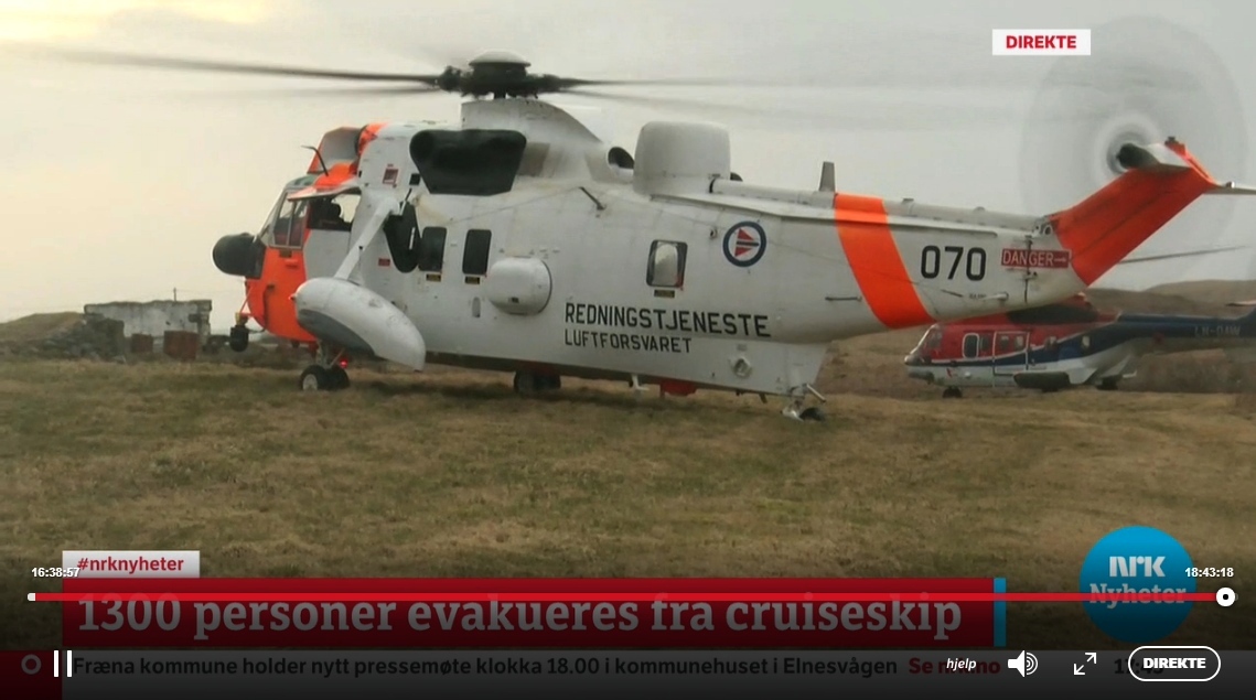 vikingsky_heko_nrkNorjan rannikolla lauantaina 23. maaliskuuta konevian saanut MS Viking Sky -risteilyalus oli ajautua myrskyssä rantaan. Käynnistyneessä pelastusoperaatiossa helikopterit vinssasivat illan ja yön aikana turvaan 479 ihmistä, Laivalla oli 1 373 matkustajaa ja miehistön jäsentä. Nyt alus liikkuu jälleen omalla voimalla.