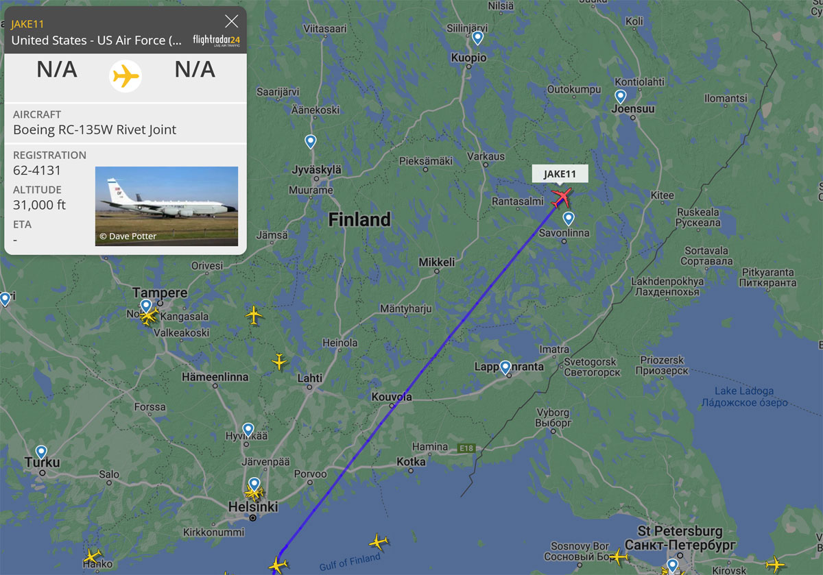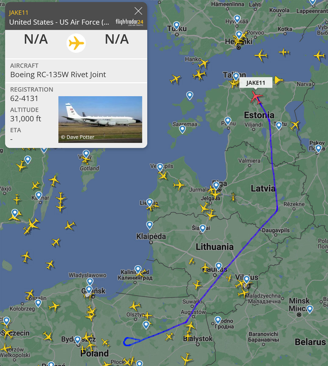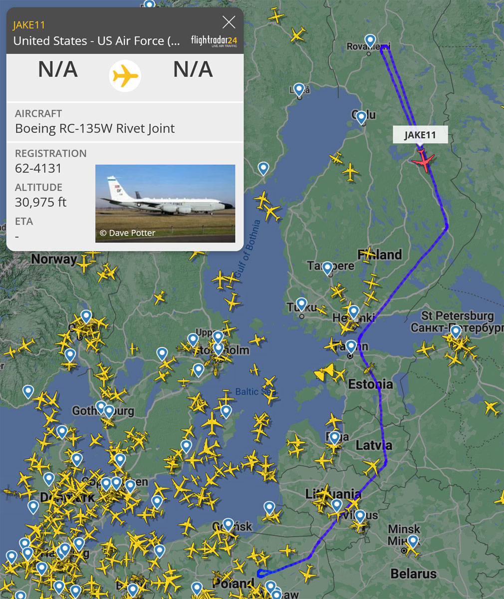 Baltian yllä lentää parhaillaan Yhdysvaltain ilmavoimien Boeing RC-135W Rivet Joint -valvontakone. Radiokutsulla Jake11 lentävä kone on mahdollisesti noussut ilmaan Isosta-Britanniasta RAF:n Mildenhallin tukikohdasta ja lentänyt Puolaan.