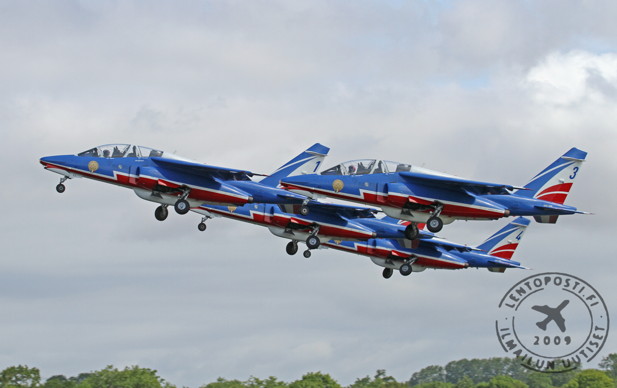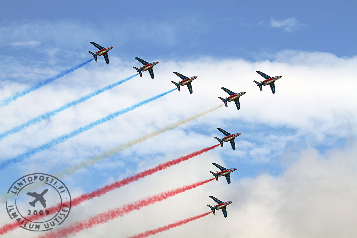 Vuonna 1953 perustettu Patrouille de France on yksi maailman vanhimmista ja parhaina pidetyistä taitotentoryhmistä. Se lentää kahdeksan-kymmenen Dassault Alpha Jet -koneen ryhmällä. Edellisen kerran Patrouille de Francelle tapahtui onnettomuus vuonna 2019, jolloin yksi Alpha Jet suistui ulos kiitotieltä Perpignanin lentokentällä. Lentäjä pelastautui tuolloinkin heittoistuimella. Patrouille de France esiintyi Suomessa edellisen kerran vuonna 2021.