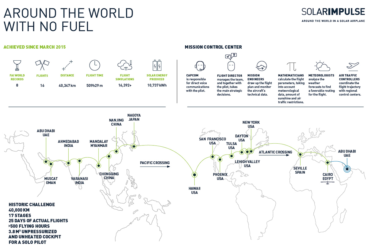Kehitys tarvitsee edelläkävijöitä sekä seikkailuja ja juuri sellainen oli Bertrand Piccardin ja André Boschbergin lentomatka Si2-koneella. Vuorotellen ohjaajat lensivät 17 etapin kautta 23 lentopäivän aikana. Kaikkiaan matkan pituus oli 43 041 kilometriä. "Kyse ei ole vain ilmailuhistoriasta vaan ennenkaikkea energian historista", totesi hankkeen käynnistäjä ja toinen lentäjä Bertrand Piccard.