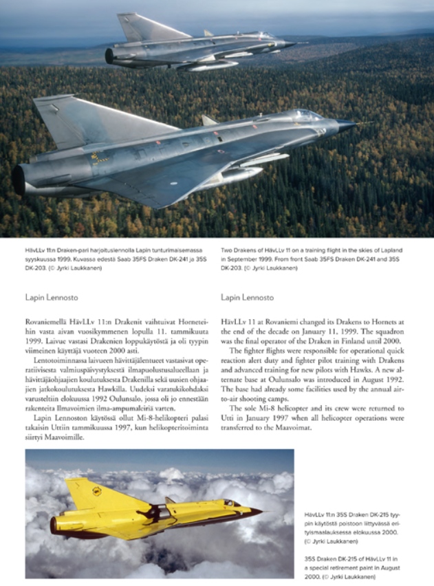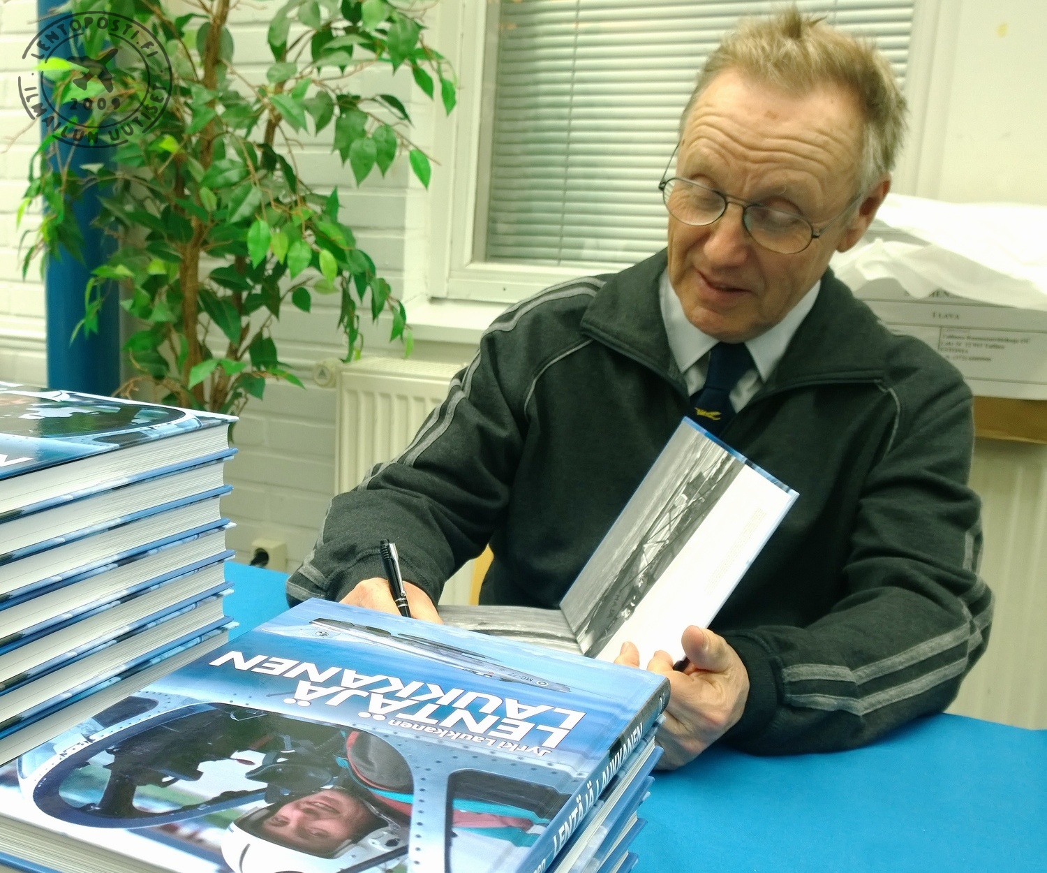 Eläkepäivillään Jyrki Laukkanen on kirjoittanut lukuisia kirjoja mm. Ilmavoimien käyttämistä konetyypeistä. Mikäli miehen ura kiinnostaa tarkemmin, kannattaa tutustua hänen edelliseen omaelämäkerralliseen teokseensa "Lentäjä Laukkanen". Se ilmestyi vuonna 2015 (kuvassa yllä hän signeeraa niitä Ilmailumuseolla). Tehtävä taivaalla -kirjassa Laukkanen on rakentanut tietopaketin, jonka arvoa korostaa erityisesti sen monipuolinen kuvitus. Taitossa teksti kulkee vierekkäin suomeksi ja englanniksi. Vaikka tämä hieman haittaa luettavuutta, se nostaa teoksen markkinointipotentiaalia maailmalle merkittävästi. Kun Ilmavoimat täytti 80- ja 90-vuotta, Siivet-lehteäkin julkaissut Apali-kustantamo tuotti Laukkasen kokoamat juhlakirjat yhteistyössä Ilmavoimien kanssa. Nyt käsillä oleva teos on kuitenkin pelkästään kirjoittajan ja Koala-kustannuksen hanke. Tiivistetysti sanoen Tehtävä taivaalla on paketti, jonka voi vastaisuudessa napata hyllystä ja varmistaa, mitä ja milloin Ilmavoimissa on tapahtunut ensimmäisten sadan vuoden aikana. Kirjan kannessa on hopeanvärinen MiG-21F-hävittäjä, Laukkasen lempikone. Oman toiveensa Ilmavoimien tulevaisuudesta ja HX-hankkeesta hän taitaa vaivihkaa paljastaa kirjan takasisäkannessa, jonka photoshopatussa kuvassa lentää Saab JAS 39 Gripen Suomen Ilmavoimien tunnuksilla. T.T. Tehtävä taivaalla on myynnissä esimerkiksi Aviation Shopissa hintaan 39 euroa.