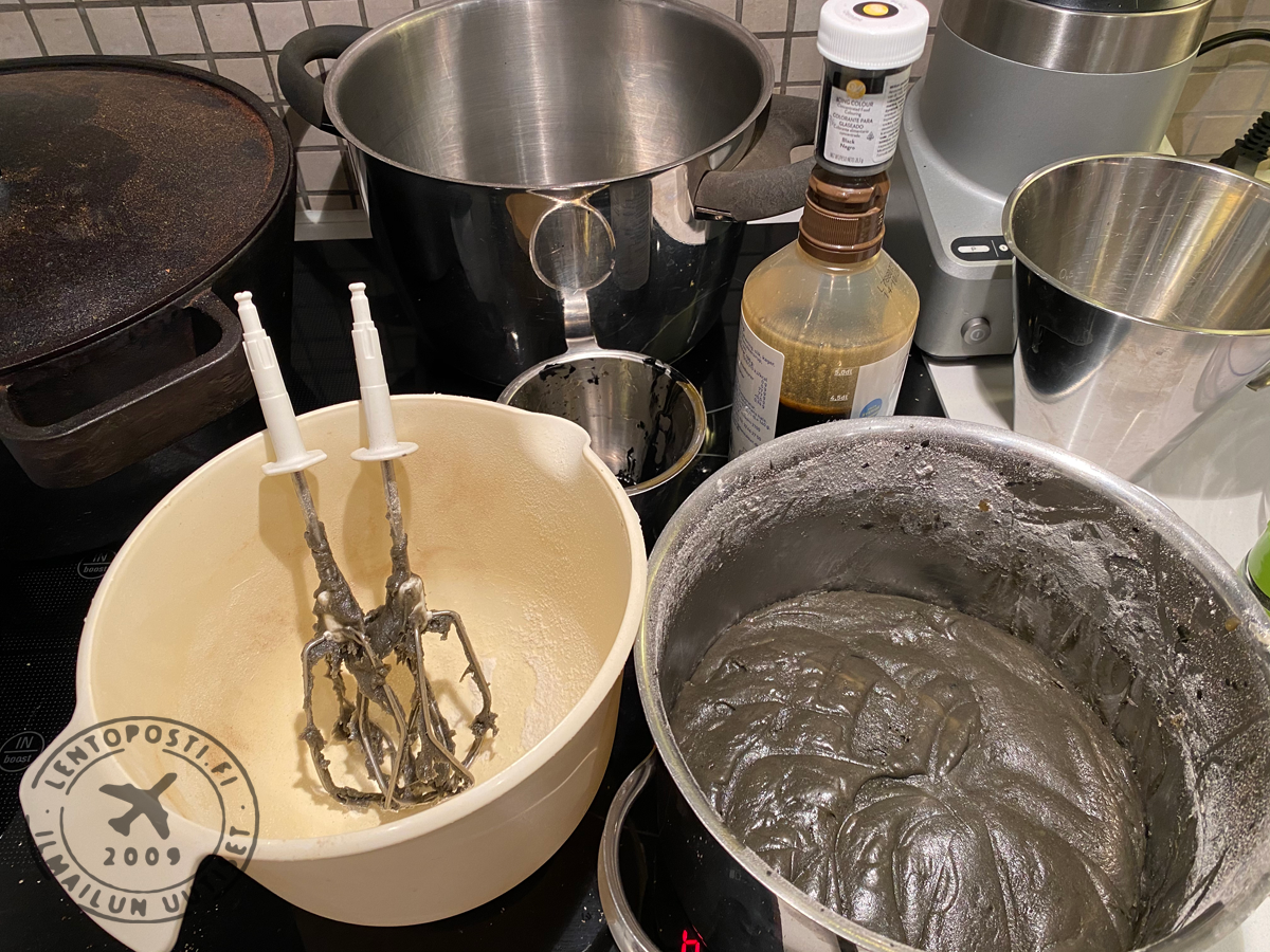 Tästä pikeeristä värjäsin elintarvikeväreillä osan mustaksi renkaita varten, osan vihreäksi Mr. Covidia varten, osan harmaaksi moottoreiden imurengasta varten ja suurimman osan jätin puhtaan valkoiseksi rungon ja siipien kuorruttamiseen. Punainen väri jäi unohduksissa kauppaan, mutta onneksi vaimo oli ostanut lasten pipareita varten valmista punaista sokerikuorrutetta, jolla sain kuorrutettua stop-merkin, Mr. Covidin silmänympärykset, piikkiproteiinien hatut ja verinorot suuhun.