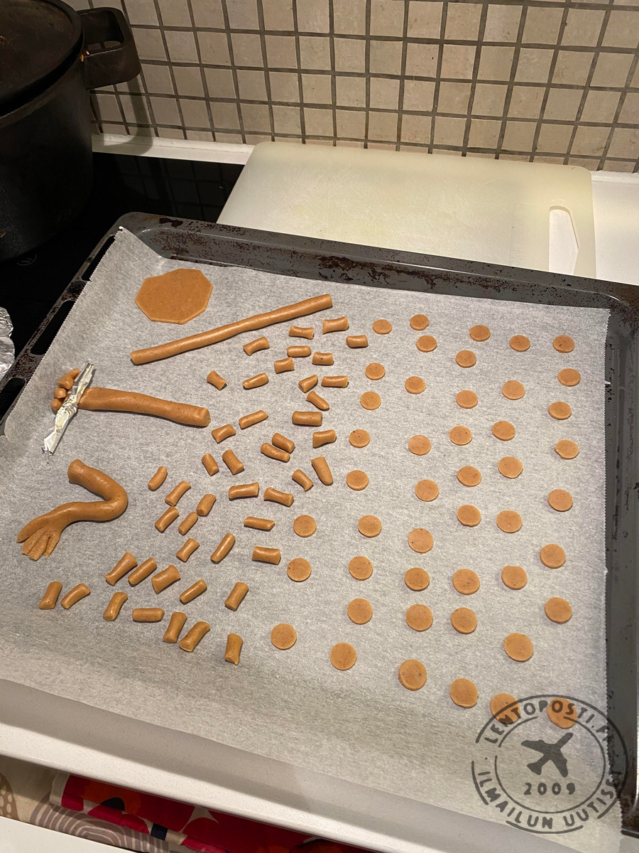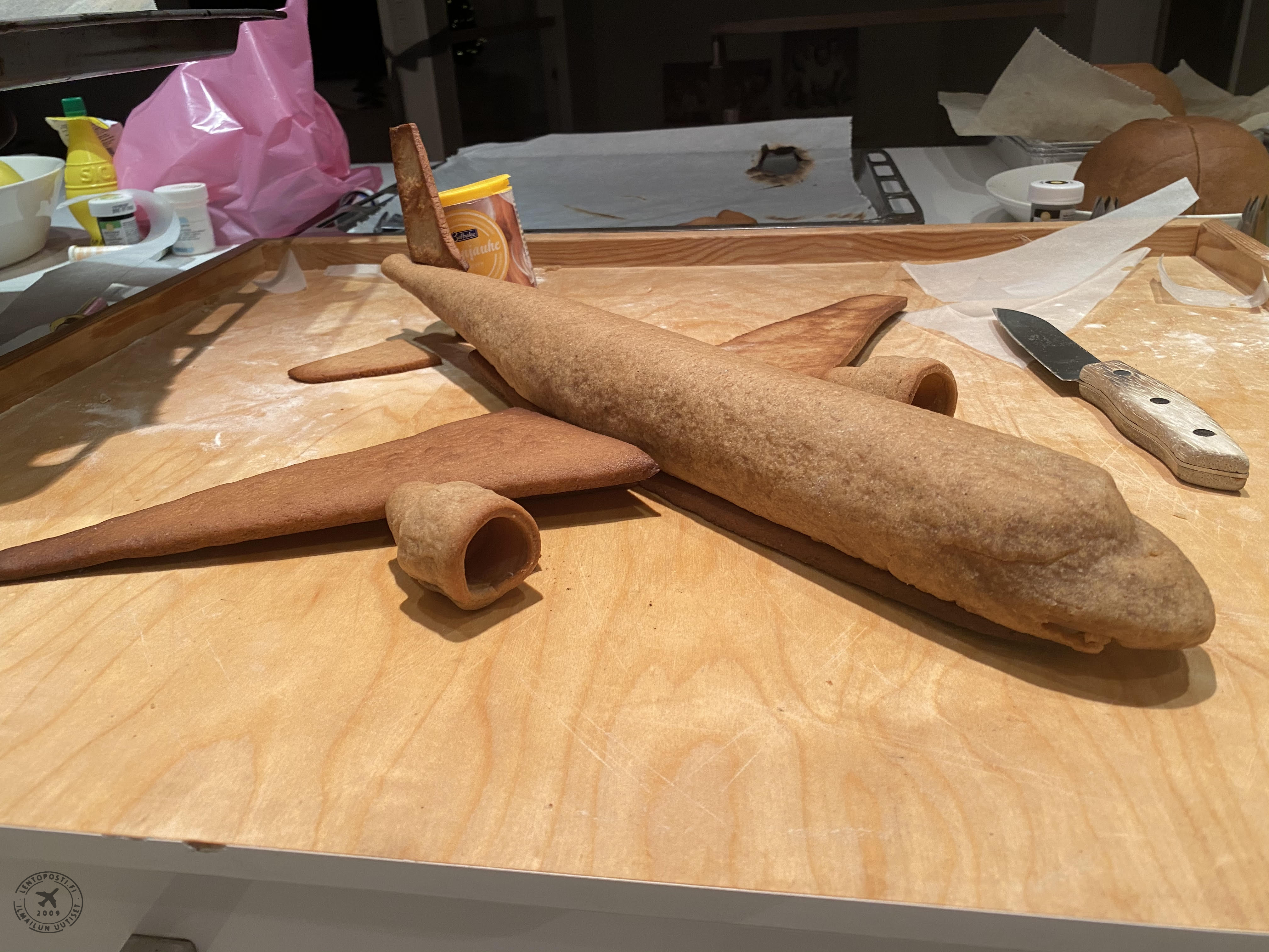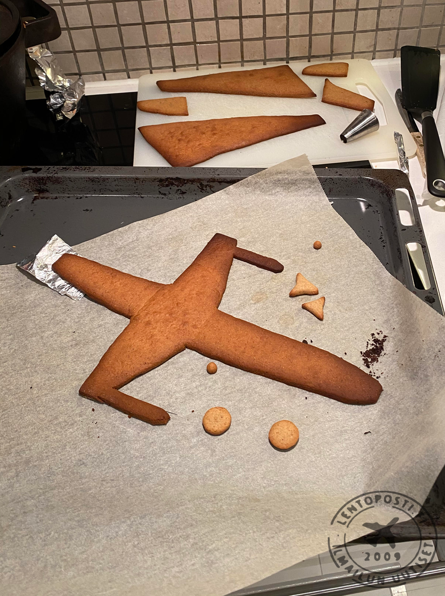 Laskutelineet vaativat hieman ronskimpaa otetta koska koko koneen paino lepää niiden päällä. Rullasin leivinpaperia tiukaksi rullaksi jonka päälle sain rakennettua onton piparkakkuputken, jotta lentokone kestäisi kasassa. Siivet, renkaat, sivu- ja korkeusvakaajat leikkasin suoraan kaulitusta taikinalevystä oikeaan muotoon. Jotta siivet pysyisivät kiinni koneen rungossa, valmistin pyöreän rungon alle ”apurungon”, jossa on enemmän tukipintaa siiville ja johon myös moottorit kiinnittyvät.