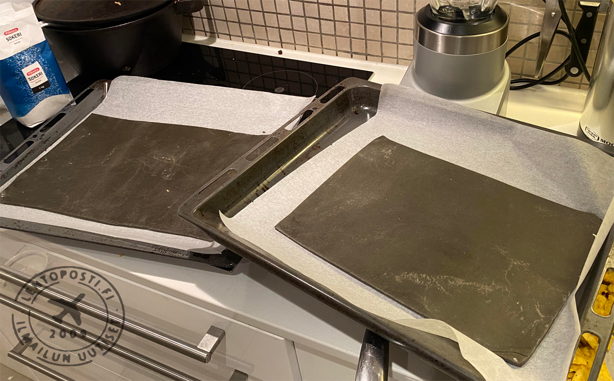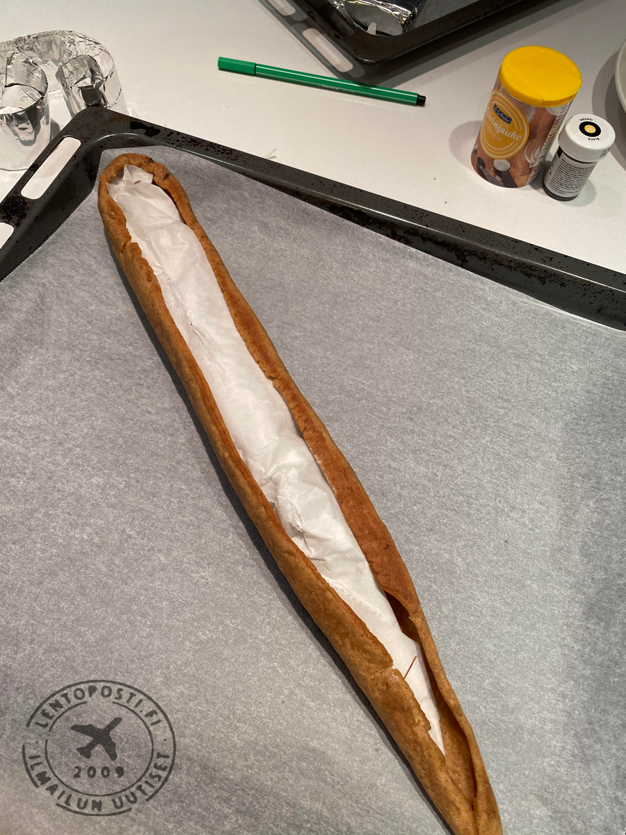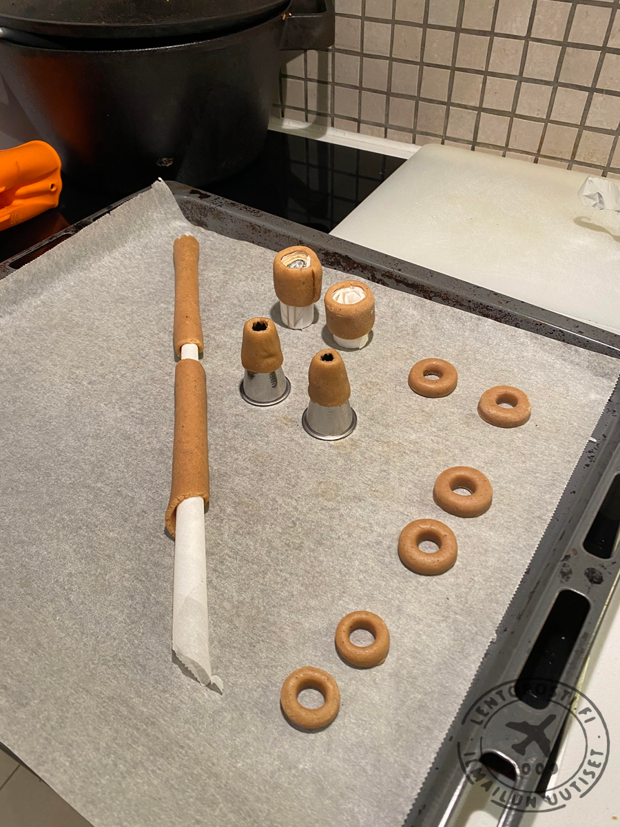 Laskutelineet vaativat hieman ronskimpaa otetta koska koko koneen paino lepää niiden päällä. Rullasin leivinpaperia tiukaksi rullaksi jonka päälle sain rakennettua onton piparkakkuputken, jotta lentokone kestäisi kasassa. Siivet, renkaat, sivu- ja korkeusvakaajat leikkasin suoraan kaulitusta taikinalevystä oikeaan muotoon. Jotta siivet pysyisivät kiinni koneen rungossa, valmistin pyöreän rungon alle ”apurungon”, jossa on enemmän tukipintaa siiville ja johon myös moottorit kiinnittyvät.