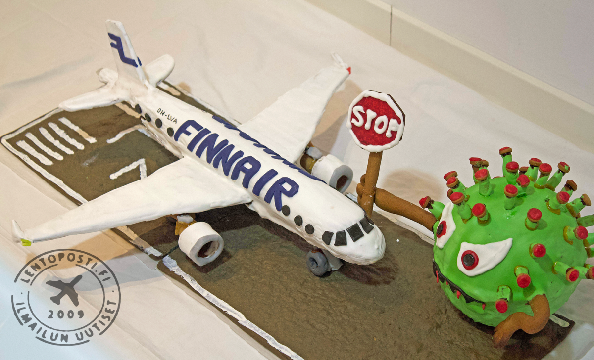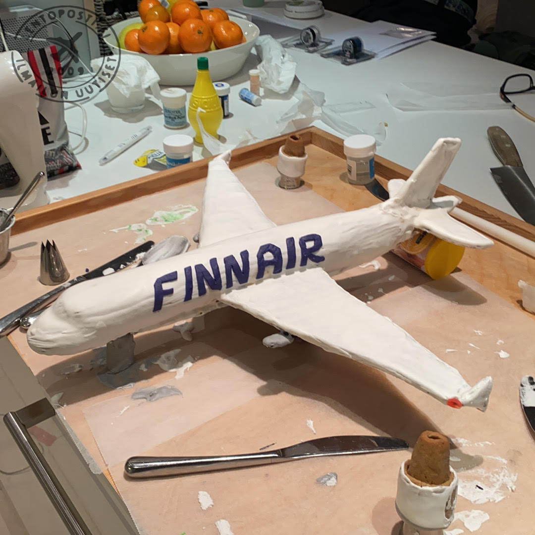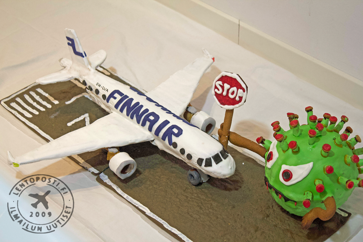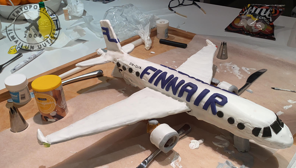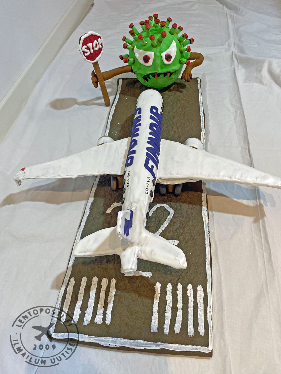 Koneen muoto oli parempi ilman kuorrutetta, mutta täytyyhän Finnairin koneen olla valkoinen. Mr.Covidin silmänvalkuaiset pursotin valkoisella kuorrutteella. Kiitotien valkoiset merkinnät maalasin pensselillä valkealla elintarvikemaalilla jota saa leivontatarvikkeita myyvistä liikkeistä. Kollegan ehdotuksesta koneen rekisteriksi tuli OH-LVA, joka lensi viimeisen matkansa Englantiin purettavaksi ja kierrätettäväksi 1.12.2020.