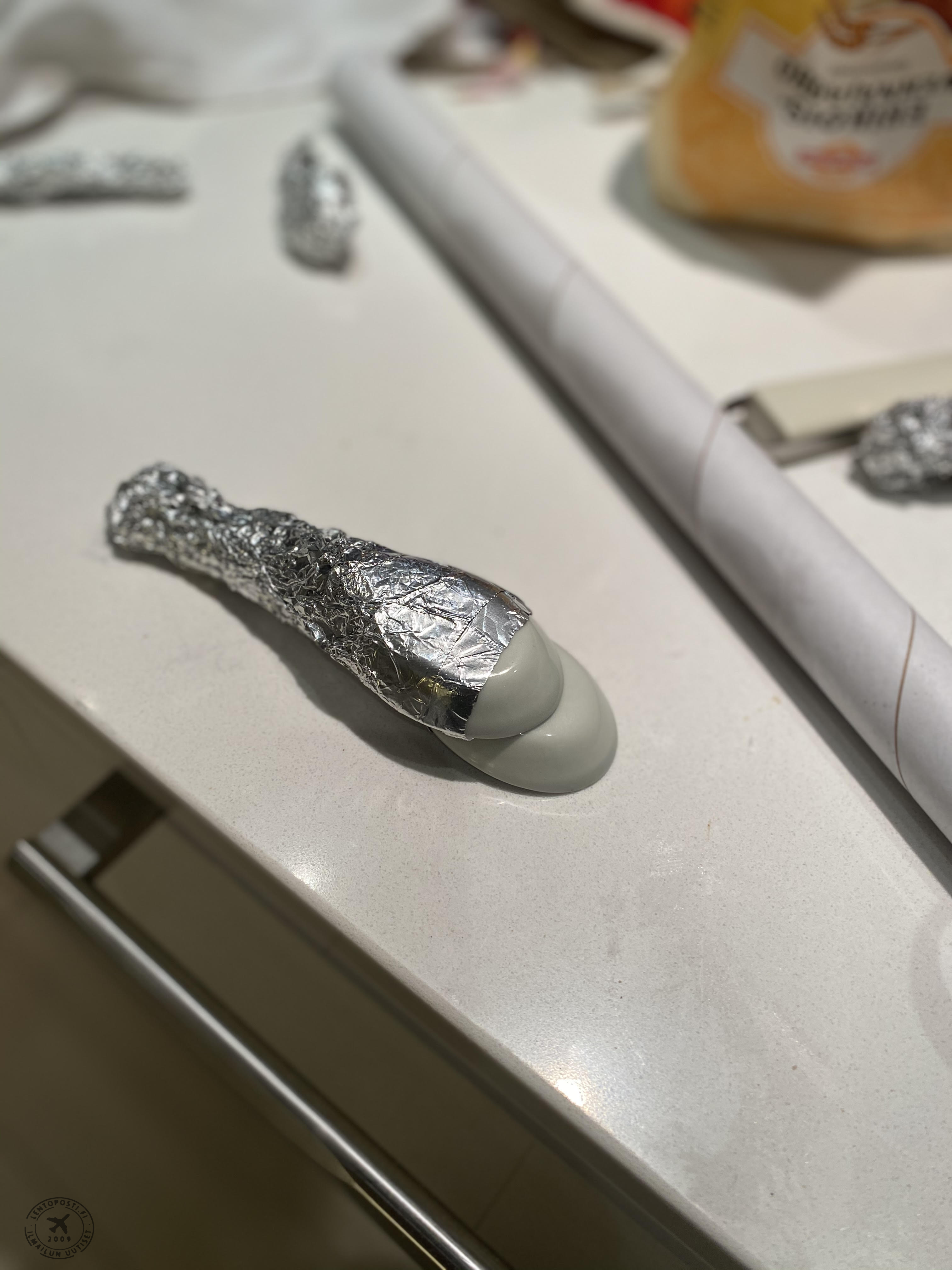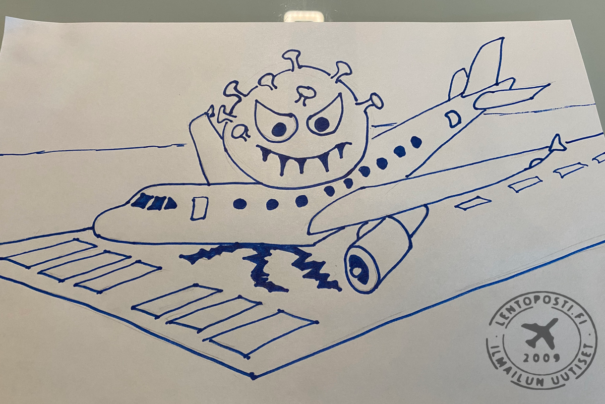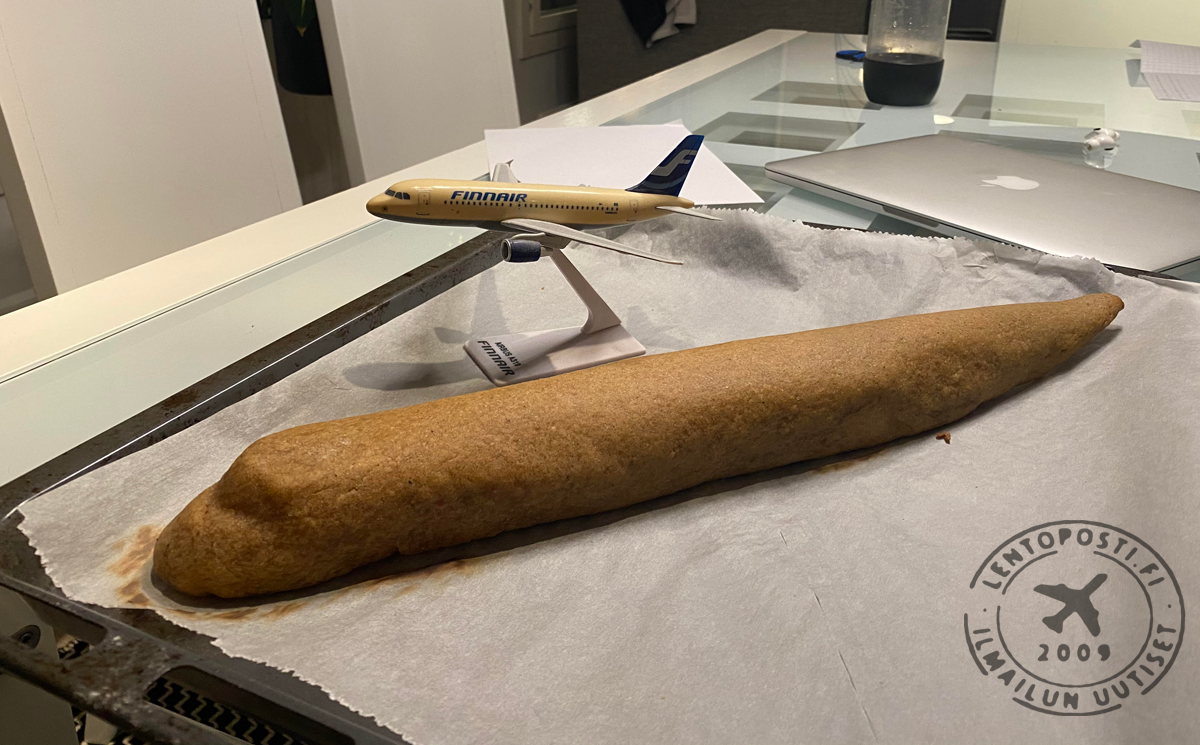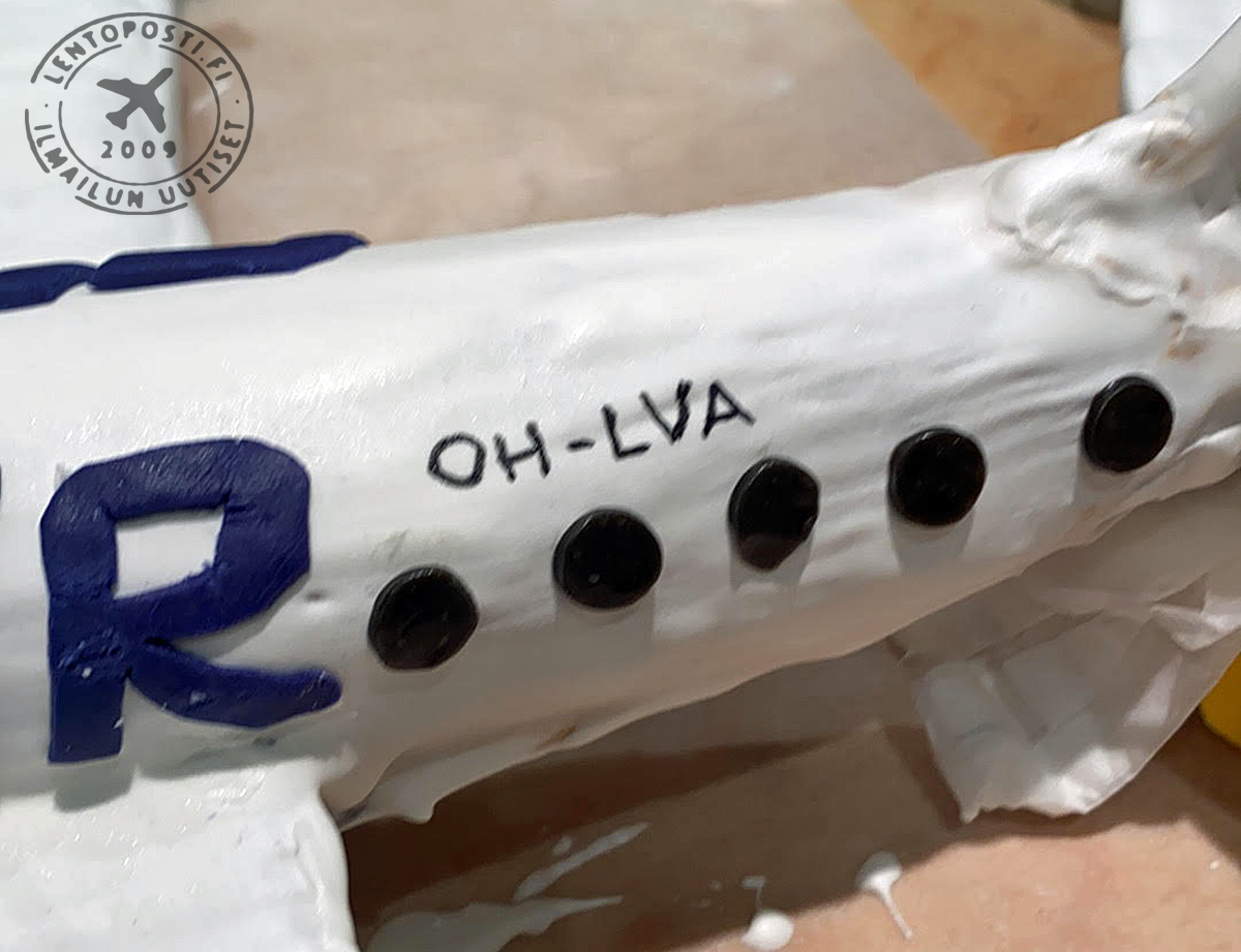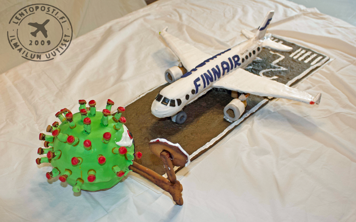 Koneen muoto oli parempi ilman kuorrutetta, mutta täytyyhän Finnairin koneen olla valkoinen. Mr.Covidin silmänvalkuaiset pursotin valkoisella kuorrutteella. Kiitotien valkoiset merkinnät maalasin pensselillä valkealla elintarvikemaalilla jota saa leivontatarvikkeita myyvistä liikkeistä. Kollegan ehdotuksesta koneen rekisteriksi tuli OH-LVA, joka lensi viimeisen matkansa Englantiin purettavaksi ja kierrätettäväksi 1.12.2020.