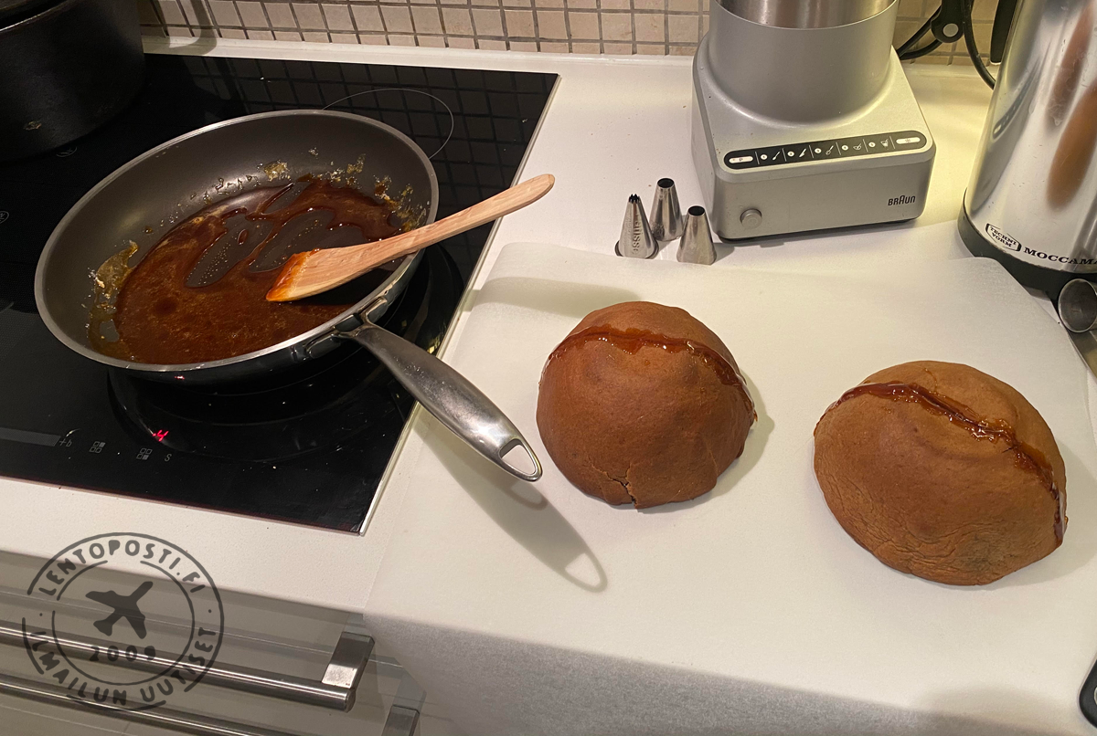 Mr. Covidin pyöreään muotoon käytin kahta pyöreää jälkiruokakulhoa. Paistettu taikina piti tosin halkaista kahteen osaan kummankin kulhon päältä jotta sen sai kypsänä irti.