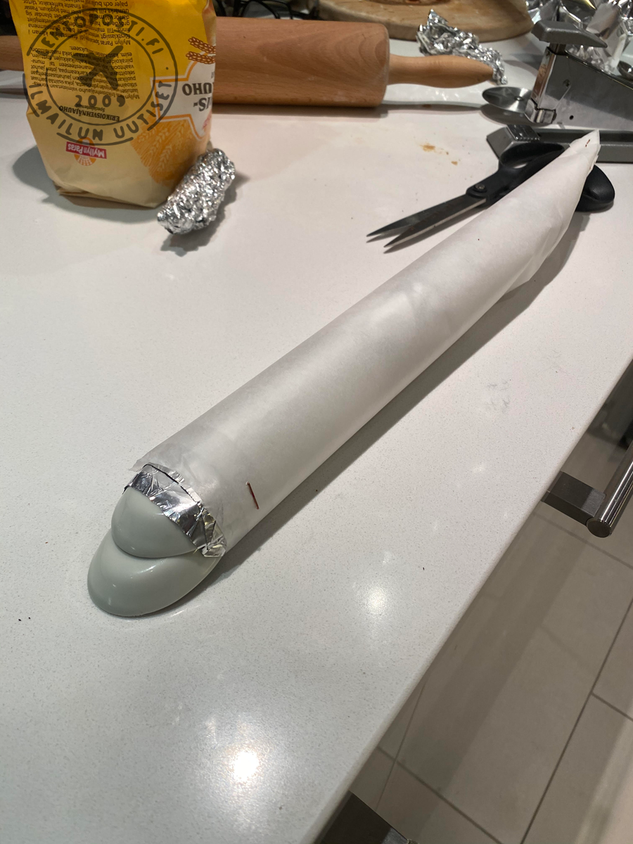 Muotit: Uuniin ei voi oikein laittaa mitä tahansa, joten muottien on oltava vähintään 200c astetta kestävää materiaalia. Koneen pyöreän rungon muotin toteutin leivinpaperista, jonka sisälle laitoin tueksi alumiinifoliota. Ohjaamon profiilin valmistin liittämällä jokaisesta kotitaloudesta löytyvät kiinalaiset keramiikkalusikat päällekkäin alumiinifolion avulla. Lusikkapaketti leivinpaperirungon sisään ja muotti oli valmis. Kaulittu taikina vaan muotin päälle ja uuniin. Moottorit tein kahdesta osasta, joiden muotteina käytin lieriöksi rullattua leivinpaperia ja metallisia leivonnaisten pursotussuuttimia.