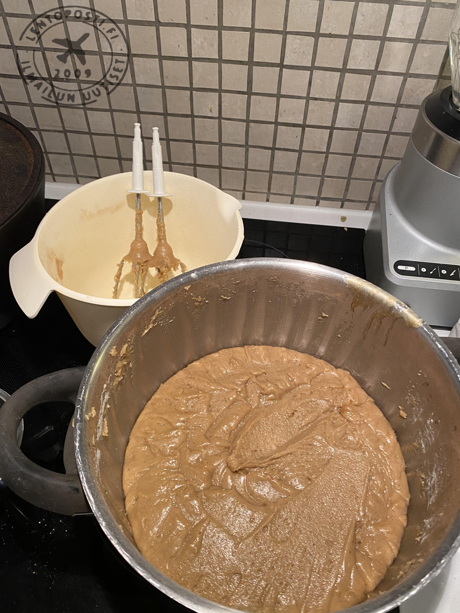 DECIDE: Päätökset: Valmistan taikinan itse ja värjään kiitotieosuuden mustaksi elintarvikevärillä. Valmistan muotit itse. Valmistan ja värjään sokerikuorrutteen itse. Otan riskin epäonnistumisesta, ajankulusta, talouden romahtamisesta ja insinöörivinoilusta. EXECUTION: Toteutus: Taikinan valmistus. Kodin Kuvalehdestä löytyi taikinaohje nimenomaan piparkakkutalon valmistamiseen. Taikinan ominaisuudet: pitää paistettaessa muotonsa eikä paisu uunissa yhtä paljon kuin tavallinen piparitaikina. Alla oleva taikina tehty 1,5 kertaisena alkuperäiseen verrattuna jotta materiaali ei ihan heti loppuisi kesken.
