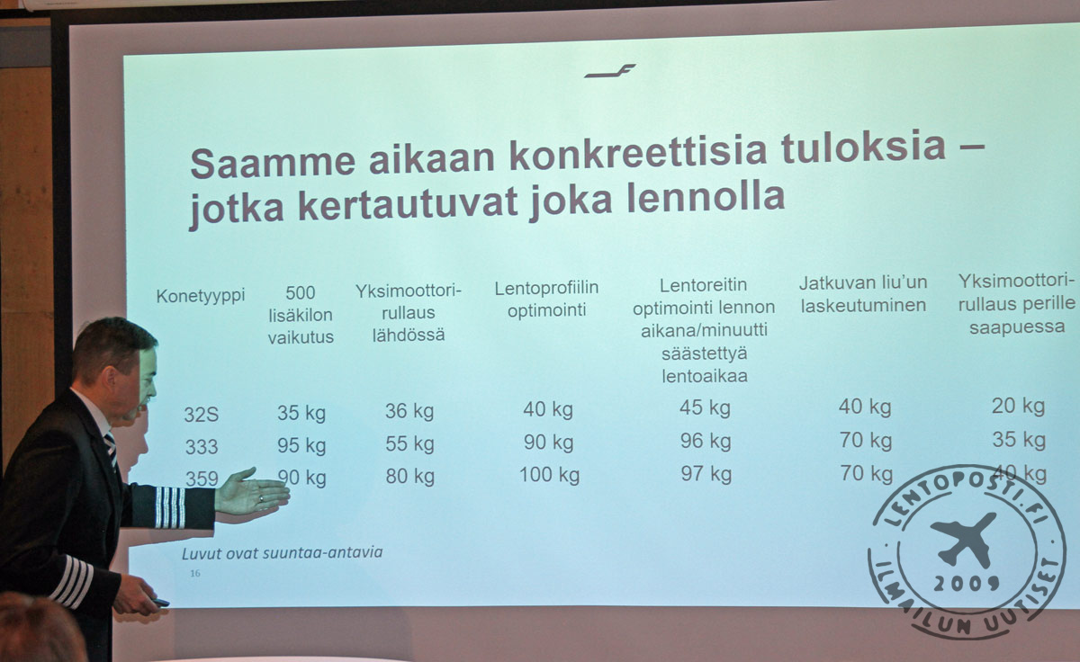 "Ohjaajat ovat todella motivoituneita asian suhteen ja säästämään polttoainetta. Tämä on olennainen osa heidän työtään", kommentoi lentokapteenin tehtävissäkin työskentelevä Hakala. Lennonsuunnitteluun liittyvällä tankkauspäätöksellä voidaan tehdä merkittäviä säästöjä. Lentokoneella voidaan suorittaa tietyissä olosuhteissa yksimoottorirullaus lähtiessä lennolle. Sillä säästetään 5-10kg polttoainetta per rullausminuutti. Vastaavasti sisäänrullaus voidaan tietyin raja-arvoin suorittaa samalla tavoin. Näitä toimia harjoitellaan myös simulaattorissa.
