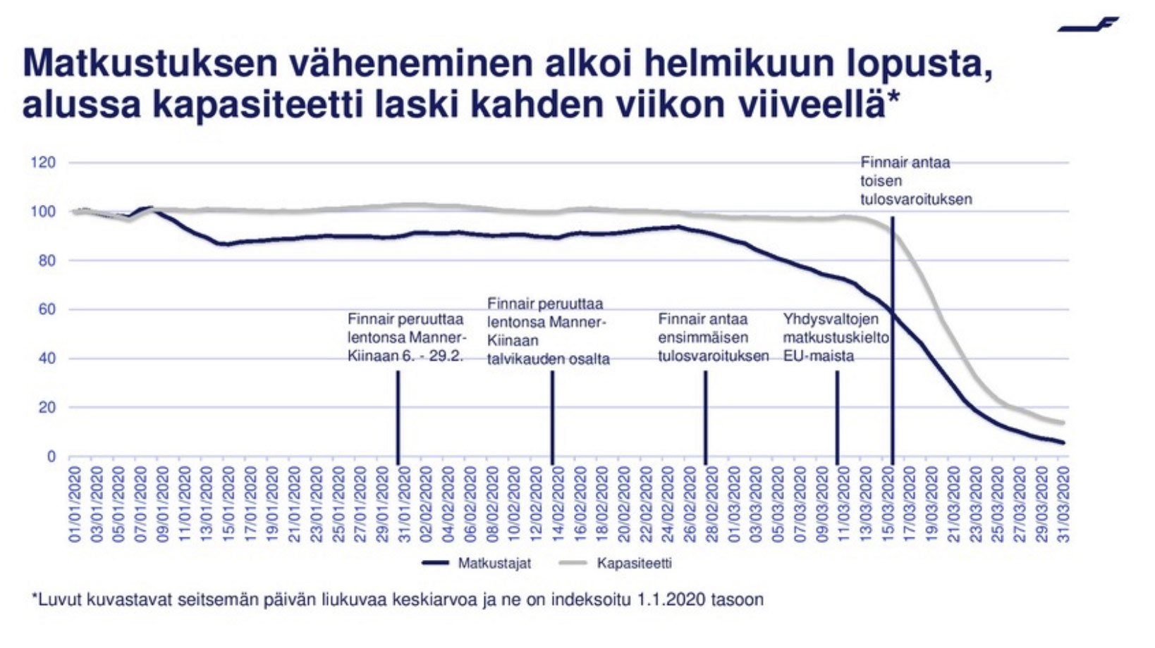 “Q1-tulosjulkistuksen luvut ovat koronaviruspandemian aiheuttamia. Ne eivät kerro mitään Finnairin kilpailukyvystä tai kannattavuudesta normaalioloissa", toteaa Manner madonluvuista. Finnairin vuosi 2020 alkoi hyvin, sillä tammikuu oli hyvä ja vahva kuukausi. Tammikuun loppua kohti edetessä koronavirustilanne alkoi eskaloitua Kiinassa. Helmikuun alussa Finnair keskeytti lennot Kiinaan. Helmikuun puolivälistä lähtien kysynnän heikkeneminen näkyi jo Euroopan ja Pohjois-Amerikan liikenteessä. Maaliskuussa 2020 tilanne alkoi edetä nopeasti ja Finnair leikkasi kapasiteetistaan Euroopassa 20 prosenttia.