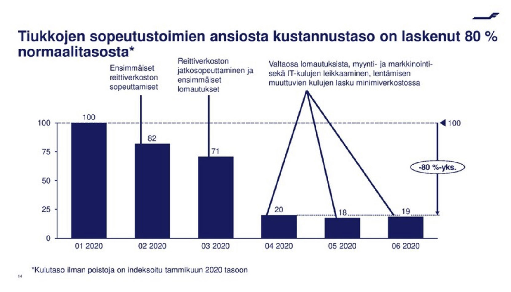 Arvioiden mukaan tappiota kertyy nykyisellään kahden miljoonan euron päivätahdilla vaikka kustannukset on painettu alas. Finnairin käytössä olevat kassavarat eivät sisällä aiemmin sovittua 600 miljoonan euron tukilainaa, jonka lisäksi Finnair tekee parhaillaan myös lentokoneiden myynti- ja takaisinvuokrausjärjestelyjä. Perinteisesti Finnair on omistanut noin puolet lentokonelaivastostaan.