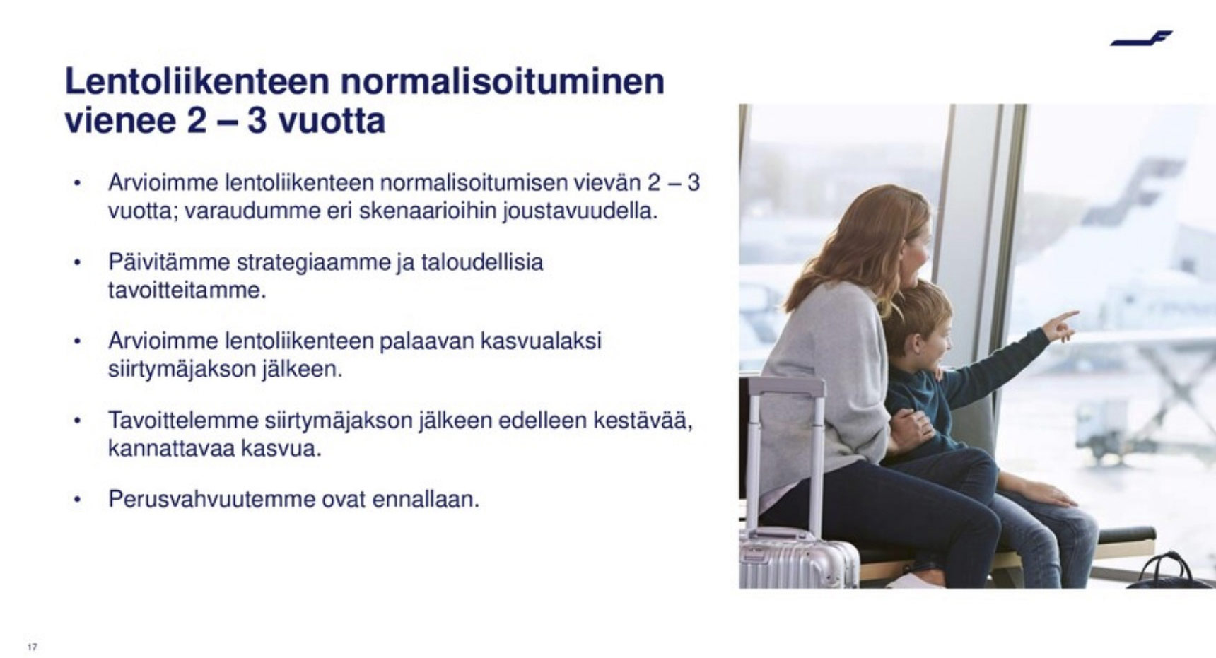 “Tämä on äärimmäinen shokki lentoliikenteelle ja tarkoittaa hidasta palautumista. Koronavirus on osa arkea vielä pitkään. Ennakoimme lentoliikenteen normalisoituvan vuoden 2019 tasolle 2-3 vuoden aikajänteellä. Toimintaa pyritään joustavoittamaan kaikilla mahdollisilla tavoilla ja olemme rakentaneet erilaisia skenaarioita”, kertoo Manner.
