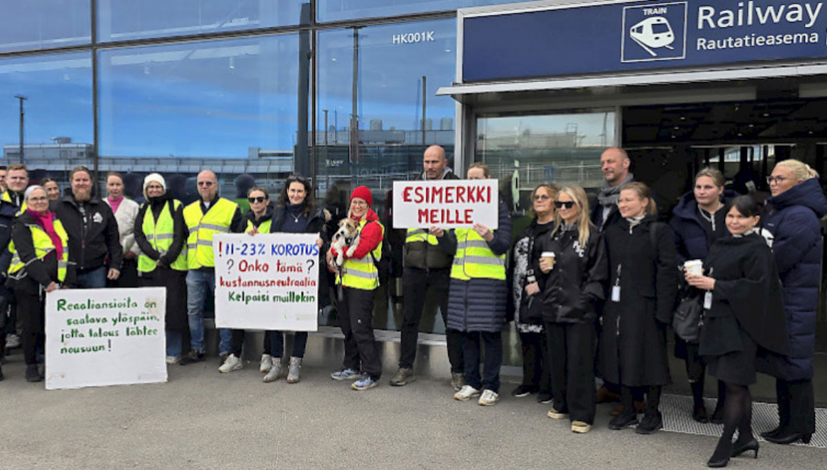 Ilmailualan Unioni IAU:n kolme ammattiosastoa, Siviililentoliikenteen työntekijät SLT, Avoin tekniikan ammattiosasto ATA ja Suomen Siviililentoliikennevirkailijoiden liitto sekä Auto- ja Kuljetusalan Työntekijäliitto AKT:n osasto 208 eli Suomen Lentoemäntä- ja Stuerttiyhdistys SLSY osallistuivat poliittiseen mielenilmaukseen torstaina 27. maaliskuuta kello 14-16. Työntekijäliitot osoittivat mieltään Finnairin osakkeenomistajien nimitystoimikunnan ehdotukseen, jossa Finnairin hallituksen palkkioita korotettaisiin jälleen kaksinumeroisin prosentein vaikka työntekijöiltä vaaditaan käynnissä olevissa työehtosopimusneuvotteluissa säästöjen jatkamista. AKT:n mukaan mielenilmaisussa oli näkyvillä kylttejä, joissa luki: "Yhtiö kriisissä, vain työntekijät maksavat laskun", "11-23 % korotus. Onko tämä kustannusneutraalia? Kelpaisi mullekin.", "Meiltä leikataan. Hallitus palkitsee itsensä. Onko reilua?". Finnairin yhtiökokouksessa hallituksen palkkioita oli ehdotettu nostettavaksi kahdessa vuodessa yhteensä noin 30-45%. Työntekijäliittojen mukaan Eurooppa- ja omistajaohjausministeri Joakim Strandin olisi pitänyt puuttua korotuksiin. Finnair joutui poliittisen mielenilmauksen seurauksena perumaan ensivaiheessa noin 70 lentoa ja mielenilmausta edeltävänä päivä peruttiin vielä 40 lentoa. Vaikutukset koskettivat arviolta noin 10 000 matkustajaa. Lue myös:
