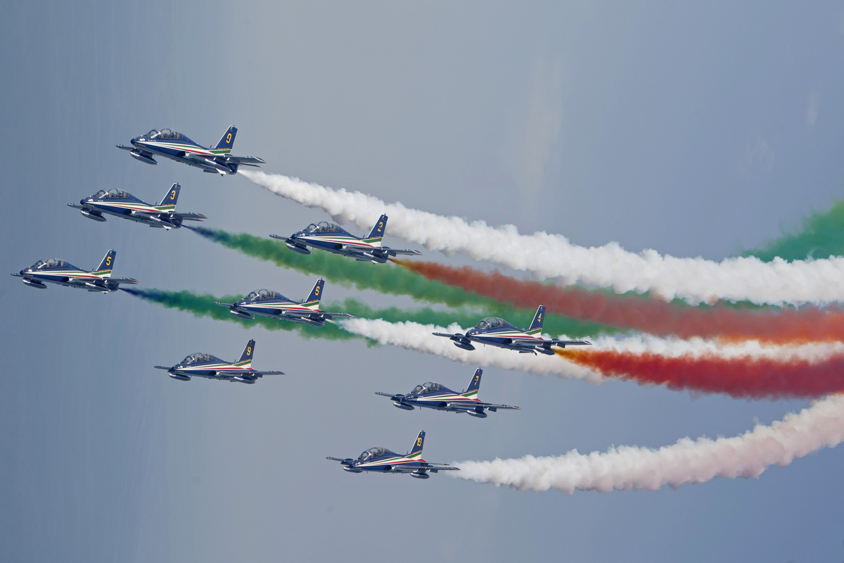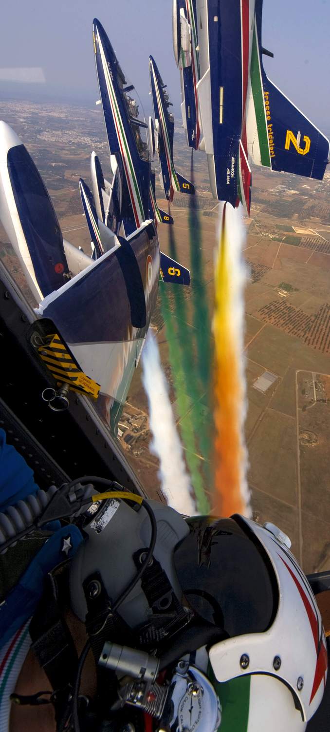 Frecce Tricolorin esitys on vaativa, mutta silti monipuolinen ja huumoriakin on mukana. Kymmenen konetta lentää yhdessä sekä erilaisissa pienemmissä muodostelmissa. Välillä soolokone tekee näyttäviä liikkeitä suhteessa muihin. Lentäjät käyttävät kutsua Pony sekä siihen liitettynä tehtävää kuvaava numeroa (esin Pony 1). Frecce Tricolori perustettiin 1961. Siitä lähtien osasto on esiintynyt Italian ja Euroopan lentonäytöksissä. Suomessa se on käynyt viimeksi Kauhavan lentäjien Juhannuksessa 1994, joten nyt kyseessä ei ole rutiinivierailu.