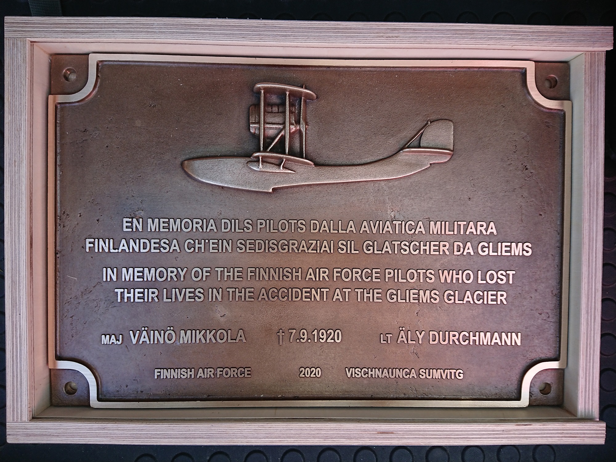Vuonna 2020 alppilentäjien muistoksi Sveitsin Sumvitgissä paljastettiin muistolaatta, joka on kiinnitetty lähelle Mikkolan ja Durchmanin koneen putoamispaikkaa.