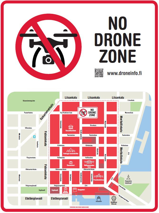 Lentokieltoalueet perustettiin keskutan alueelle yleisen järjestyksen ja turvallisuuden säilymisen keskeisille alueille. Tieto Meilahden (EFP35), Munkkiniemen (EFP40) ja Kruununhaan (EFP50) kieltoalueiden olemassaolosta on ollut tähän asti huonosti saatavilla drone-lennättäjille. Alueet tulivat voimaan valtioneuvoston asetuksella 28. toukokuuta 2015. Kyse on alueista, jotka ovat valtion johtamisen kannalta tärkeiden kohteiden välittömässä läheisyydessä. Kylttien asentamisen tavoitteena on lisätä tietoisuutta lennättäjien keskuudessa. Tähän saakka tieto on ollut tarjolla ilmailun tiedotuspalveluissa ja Trafin verkkosivuilla. "Kyseessä on perusliikennemerkin kokoinen eli aika näkyvä uusi merkki. Ne pyritään sijoittamaan laajasti siten, että näkyvyyttä tulisi katuosuuksille joita pitkin ihmiset kulkevat näille alueille", kertoo rafin johtava asiantuntija Jukka Hannola Lentoposti.fi:lle. "Uusia NoDroneZone-kylttejä kiinitetään liikennemerkkitolppiin valopylväisiin, seiniin ja aitoihin. Kaupunkikuvaan tulee kaikkiaan 70 lentokieltoalueista kertovaa merkkiä", jatkaa Hannola. Kyseiset merkit ovat myös kansainvälisiä sisältäen muuallakin käytössä olevan kamerakopterikuvan sekä No Drone Zone -tekstin. Näin tieto aluiesta avautuu myös turisteille, joita saapuu mm. suoraan kieltoalueella risteilyaluksilla.