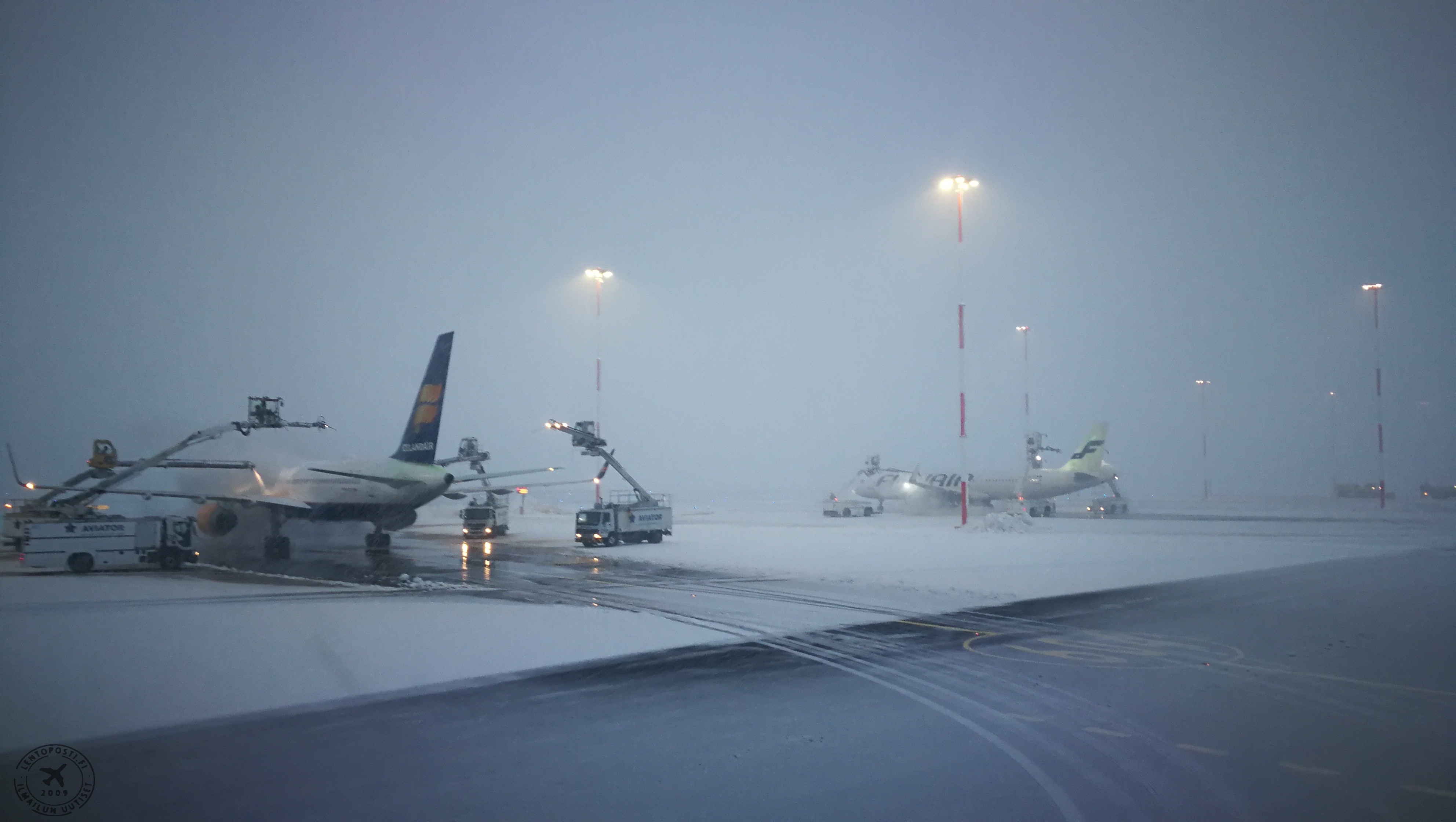 Lentosääennusteen mukaan sankka lumisade jatkuisi iltaan saakka. Helsinki-Vantaalla vallitsee lisäksi voimamas ja puuskittainen kaakkoistuuli. Olosuhteet tuovat omat haasteensa kiitotien lumenpoistoon ja Finavia kertoo käytössä olevan vain yksi kiitotie. Sen käyttöön tulee käyttökatkoja aurauksen seurauksena. Yhden aurauksen kesto kunnossapidon ja lennonjohdon menetelmin kestää noin 12 minuuttia. Finavia kertoi iltapäivästä saaneensa avattua myös toisen kiitotien lentoliikenteen käyttöön. Lentoasemalla on edelleen liikennerajoituksia niin lähtevälle kuin saapuvalle liikenteelle.