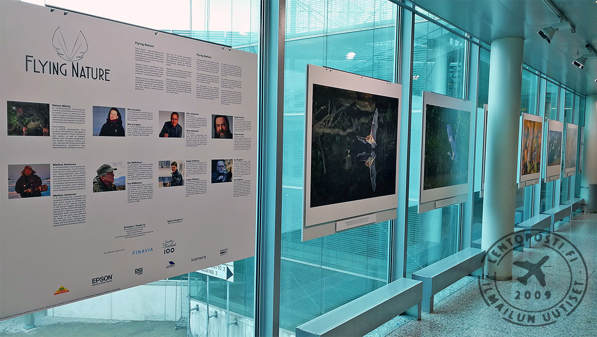 "Halusimme näyttelyyn laajan skaalan suomalaisia lintuja ja muita lentäviä. Valinta ei ollut helppo – kilpailutöitä katsellessa todella vaikuttui suomalaisen luontokuvauksen korkeasta tasosta", kertoo näyttelyn yhteistyökumppani Color-Kolmio Oy:n Merja Ailama-Mäkitalo. Flying Nature -näyttely on esillä Helsinki-Vantaalla vuoden 2017 loppuun saakka. Näyttelyn ovat tuottaneet yhteistyössä Finavia, Color-Kolmio Oy, Epson, Ilmailutoimittajat ry, Finnfoto, Kamera-lehti sekä Merja Ailama-Mäkitalo. Näyttely on lentoaseman T1 ja T2 -terminaalit yhdistävän käytävän varrella lähempänä jälkimmäistä. Saman käytävän varrella sijaitsee Kehäradan rautatieasema, jonka viitoituksia seuraamalla löytää paikalle. Alueelle on vapaa pääsy kaikille lentoasemalla asioiville ympäri vuorokauden. Valokuvanäyttely on osa Finavian ArtPort-taidekonseptia, jonka tavoitteena on tarjota matkustajille rentouttavia pysähdyspaikkoja hektisessä lentokenttäympäristössä. Lisäksi se tarjoaa taitelijoille mahdollisuuden saada töitään laajan kotimaisen ja kansainvälisen yleisön eteen: Helsinki-Vantaan kautta kulkee joka päivä täyden Olympiastadionin verran ihmisiä. Vaihtuvia Ilmailuaiheisia valokuvia jo vuodesta 2007 lähtien Finavian, Ilmailutoimittajien ja Merja Ailama-Mäkitalon yhteistyön tuloksena syntynyt näyttelyidea on vuosien varrella esitellyt ilmailua ja lentämistä useista näkökulmista suomalaisten ja kansainvälisesti tunnettujen kuvaajien töiden kautta. Monelle ilmailun ystävälle vaihtuva näyttely on säännöllinen vierailukohde Helsinki-Vantaalla. Vaihtuvassa valokuvanäyttelyssä ovat olleet esillä mm seuraavien kuvaajien otoksia: japanilainen ilmasta-ilmaan -valokuvaaja Katsuhiko Tokunaga, suomalainen Hornet-lentäjä Henrik Elo, Mikaela Löfroth ilmailumuotokuvillaan ja Krister Löfroth Anti-Gravity Women -kuvillaan. Lisäksi esillä on ollut julkisuuden henkilöiden saapumisia vuosien varrella Helsinki-Vantaan lentoasemalle sekä avaruussukkulan matka museoon Yhdysvaltojen halki. Näyttelyssä on ollut kahdesti esillä yhdysvaltalaisen Smithsonian-instituutin valokuvaaja Carolyn Russon töitä. Edellisellä kerralla oli hänen näkemyksiään maailman lennonjohtotorneista. Myös Finnairin matkustamohenkilökunnan vuosikymmenten aikana käyttämät virkapuvut olivat mukana näyttelyssä. Valokuvauksesta kiinnostuneille on nähtävää myös lentoaseman portilla 38. Peking-aiheinen näyttely on toteutettu yhteistyössä Helsinki-Vantaan sisarlentoaseman, Pekingin lentoaseman, kanssa ja se on esillä toukokuulle 2017 saakka.