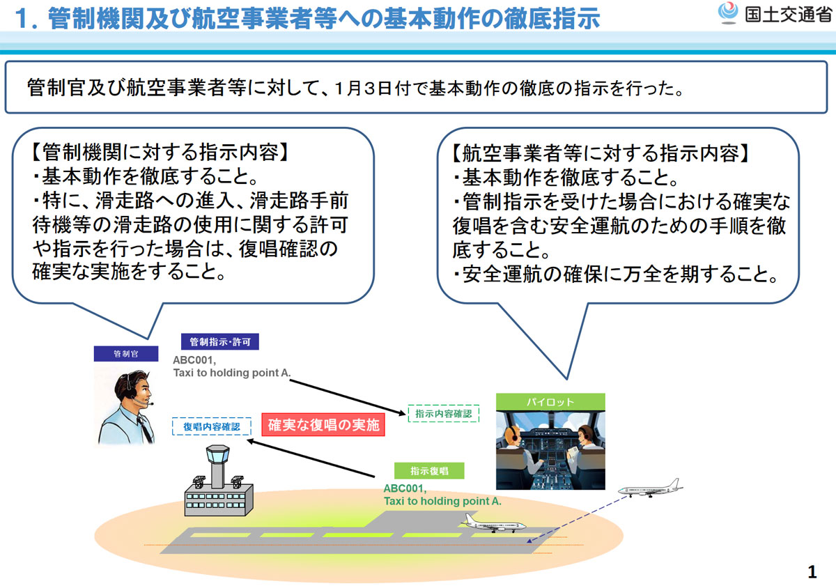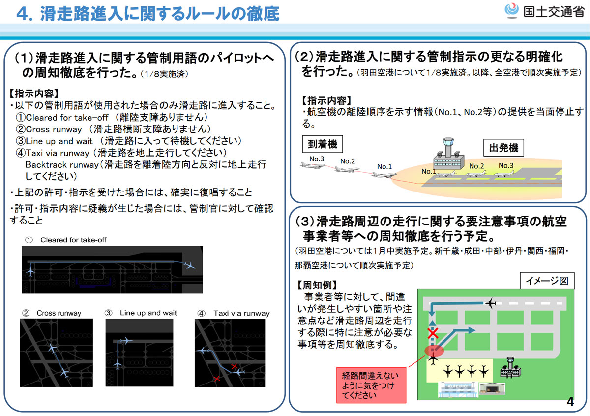 MLIT:n julkistamiin toimiin kuuluvat perusteellinen ohjeistus lennonvarmistustoimijoille ja lentoliikenteen harjoittajille, lennonjohtajien valvontajärjestelmien parantaminen, lentäjän tekemä visuaalinen valvonta, kiitotielle siirtymisen sääntöjen täysi täytäntöönpano sekä lennonjohtajien ja lentäjien välisen kommunikoinnin vahvistaminen.