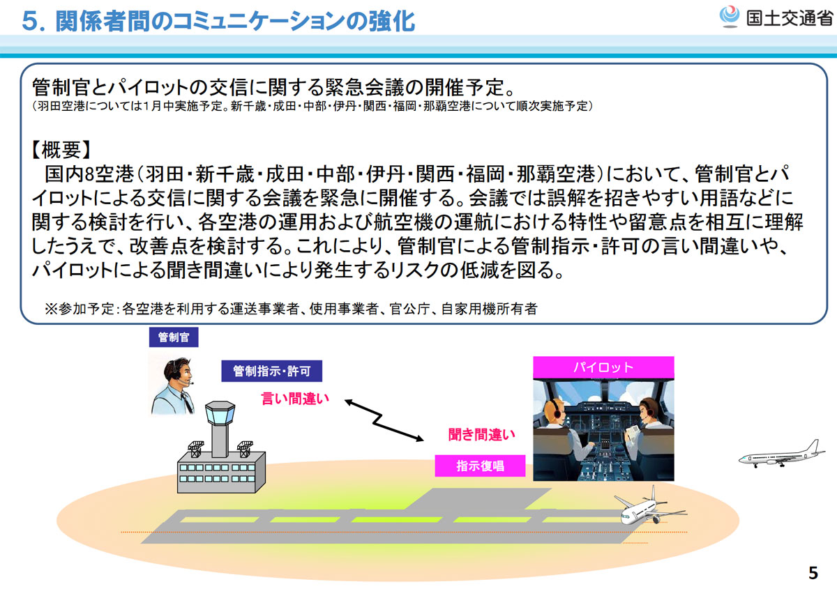 Osapuolten välistä kommunikaatiota kehitetään lentäjien ja lennonjohtajien välisessä hätäkokouksessa, joka pidetään Hanedassa jo tammikuun aikana. Muilla lentoasemilla vastaava kokous järjestetään myöhemmin.
