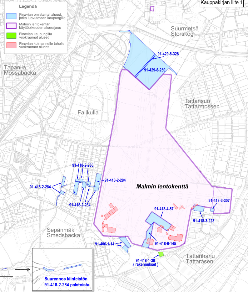 Tehtävien maakauppojen avulla Finavia luovuttaa Helsingin kaupungille omistusoikeuksin kaupan kohteet Helsinki-Malmin lentoasemalta ja Helsinki-Malmin käyttöoikeusalueiden hallinta palautetaan takaisin Helsingin kaupungille. Kauppakirjan ehtojen mukaisesti Finavia Oyj (Suomen valtio/Ilmailulaitos) luopuu sopimusten 10.5.1935 (nro 4210), 17.7.1939 (nro 4210a), 15.11.1948 (nro 4210b), 19.11.1951 (nro 6297) ja 21.12.1995 (nro 3057) mukaisesta Malmin lentokenttäaluetta koskevasta käyttöoikeusalueesta.