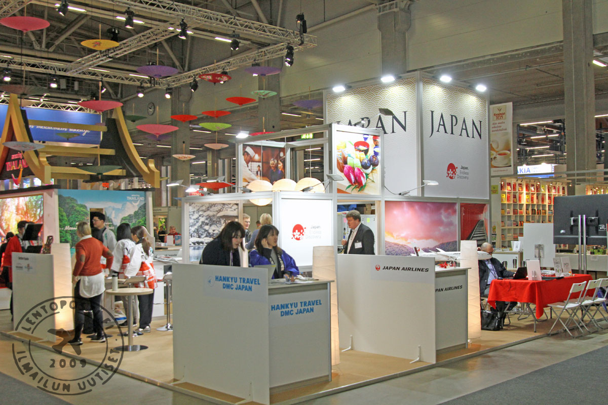 Matkamessukävijät ottaa vastaan suuret Espanja-mainokset sekä suuri Finnairin valoseinä. Messuosastoilla ovat mukana lentoyhtiöistä jo perinteisesti Japan Airlines osana laajempaa Japanin matkailusta kertovaa osastoa. JAL tarjoaa lentoja Helsingin ja Tokion välillä.