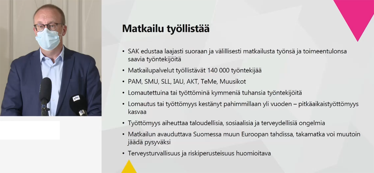 ”SAK edustaa laajasti matkailussa suoraan ja välillisesti työtä tekeviä niin logistiikassa, ravitsemis- ja majoitusalalla kuin kulttuuri- ja tapahtuma-alalla. Osa on ollut lomautettuina tai työttöminä jo toista vuotta eli ovat pitkäaikaistyöttömiä”, sanoo SAK:n puheenjohtaja Jarkko Eloranta.