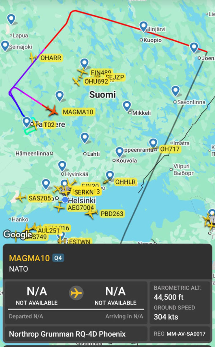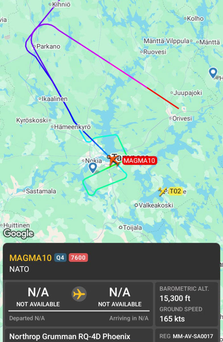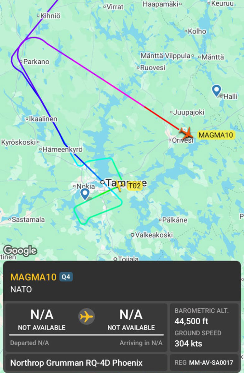 Miehittämätön ilma-alus suoritti tämän jälkeen lähestymisen Tampere-Pirkkalan lentoasemalle, jonka jälkeen se katosi jälleen lennonseurantapalveluista Oriveden yllä noin kello 10.30 Suomen aikaa. Alimmillaan Phoenix kävi Flightradar24-palvelun mukaan 3900 jalan eli noin 1200 metrin korkeudessa. Ilmavoimat vahvisti Lentoposti.fi:lle, että kyseessä oli NISRF:n tulevaan RQ-4 Phoenix -kaluston tukeutumiseen liittyvä harjoituslähestyminen Pirkkalaan. Lennonseurantapalvelussa näkyi tuolloin myös radiohäiriöstä kertova toisiotutkavastaimen koodi, joka oli mahdollisesti osa harjoitusta.