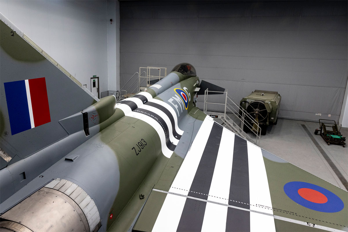Royal Air Forcen Typhoon Display Team julkisti Eurofighter Typhoon -hävittäjänsä erikoismaalauksen vuoden 2024 esityslentokaudelle RAF:n Coningsbyn tukikohdassa 22. huhtikuuta 2024. Moggy-nimellä tunnettu hävittäjä (ZJ913) on maalattu D-dayn eli Normandian maininnousun 80-vuotisjuhlallisuuksia kunnioittavaan maalauskaavioon.