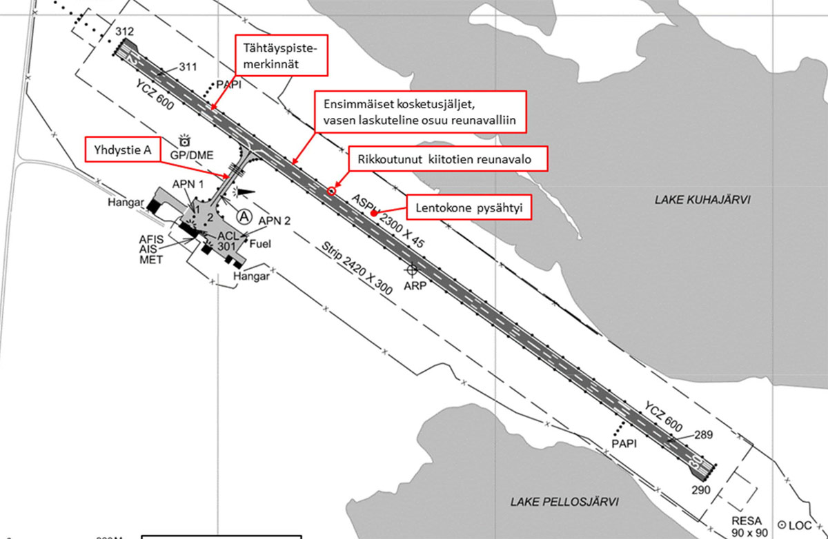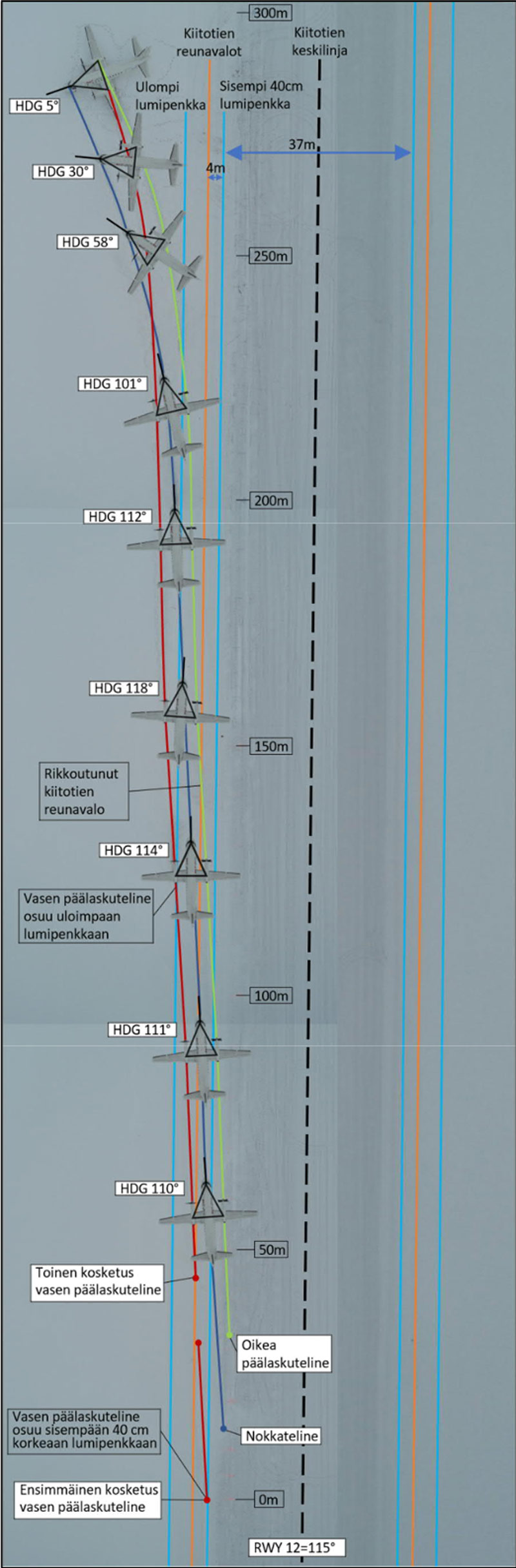 Lumessa olleiden jälkien perustella koneen vasen päälaskuteline osui vasemman reunavallin päälle kunnostamattomalla alueella. Nokkateline kosketti kiitotietä, jonka jälkeen vasen päälaskuteline nousi hetkeksi ilmaan ja oikea päälaskuteline kosketti maata. Vasen päälaskuteline tuli uudelleen maahan. Lentokoneen edettyä noin 100 metriä ensimmäisestä kosketuskohdasta sen nokkateline ja oikea päälaskuteline päätyivät kunnostetun kiitotiealueen ulkopuolelle.